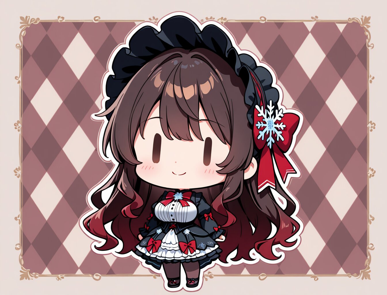 masterpiece,best quality,ultra detailed,dark brown hair,red tips,red bow,wavy hair,long hair,snowflake_hair_ornament,big breast,seductive_smile,gothic_lolita, BREAK chibi,full body,1girl,solo,(| |:1.3),comic,abstract_background,argyle_background,red and brown,