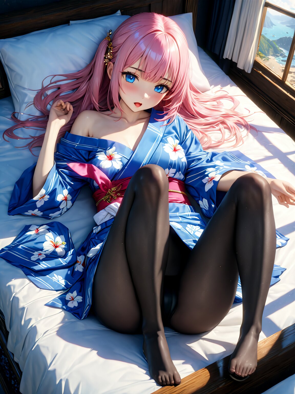 cinematic lighting, dramatic lighting, cinematic atmosphere, highly detailed, ultra-detailed, (best quality, 4k, 8k, highres, masterpiece:1.2), ultra-detailed, Transparency:1.2, beautiful breast, margin, (realistics:1.8), 3D, Crystal clear light:1.3, Blue light in hair, Clean pupils, extremely cute and beautiful girl, detailed white face, beautiful detailed eyes, Clean azure pupils, Tear Bags, shine pink hair:1.2, Transparency pink hair:1.2, Pink hair mixed with blue, sparcle blue eyes, beautiful breast, beautiful detailed pink lips, breast, shine:1.5, blush, full body, beautiful callarbone, wa lolita1.3, sholoder hair, (side bangs:1.5, Tuck my bangs to the side:1.4), tie one side only low pigtail, one side only tie hair;1.2, sholoder hair, only sidetail, (white Hibiscus-print blue yukata:1.3), off-shoulder yukata, short yukata, surrounds you in an aura of lame, Sexual activity, Sex on the bed, embarrassing eyes and mouth, open mouth, from top view, normal position, legs lifted up in M-shape, knees above stomach, legs floating in the air, toes and knees up, Bending the knees , black opaque pantyhose, thick jetblack tights, beautiful black pantyhose, Fine-tuned fingers, beautiful fingers, white covered black pantyhose, <lora:flat2:0.7000000000000002> <lora:Asian_Cute_Face:2.0000000000000004>