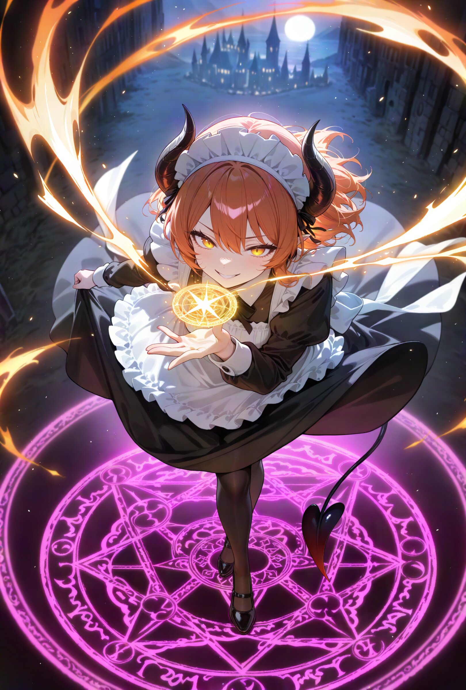 (portrait:1.0) (from above,looking up:1.0) dark theme, Located in the Austrian Alps, a beautiful castle perched by the lakeside., 1girl, (ultra-detailed), solo, maid, pale skin, pale darkorange hair, (beautiful slit pupils, naughty face:1.0), long sleeves classic maid uniform, long skirt, maid headdress, maid apron, luminous effect lens flare lotion shiny-glistening cute girl solo full body, standing, crossed legs, skirt lift, graceful courtesy, bowing (demon girl, demon horns, demon tail, , + +:1.1), (ultra detailed floating glowing magic circle:1.2), (high saturation) depth of field, bokeh, super fine concept art, hard surface, 8K, unreal engine, masterpiece, best quality, amazing quality, very aesthetic, absurdres, you can add tag scenery, (volumetric lighting), To make the background more distinctive. professional art lots of details, , overexposure, shiny-glistening, (watercolor style:0.0), (pastel color style:1.2) 4ur4_illu,shiny, glowing, glowing particles, glowing light particles, light particles, flame , <lora:noline (1):-0.5> <lora:sdxl2-flat2-512b:0.2> <lora:facelightup_xl_v10:0.5> <lora:V2_yakumo_alchemy:0.5> <lora:Aura_illu:0.1>