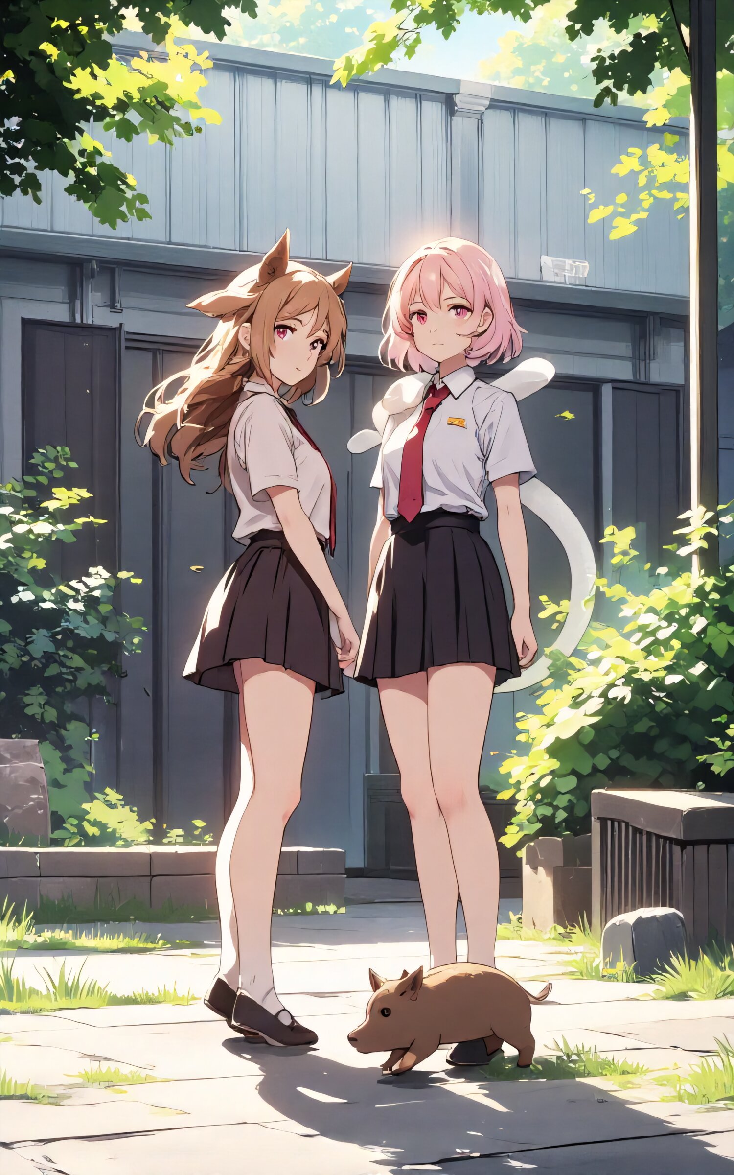 2girls, RIRIA is anime style, high resolution, full body, girl with boar ears, long light brown hair, wearing a Japanese school uniform, standing in a peaceful schoolyard, a baby wild boar (uribō) at her feet, \n HINAKO is anime style, high resolution, full body, girl with light pink hair, pink eyes, short wavy bob hairstyle, wearing a Japanese school uniform, accompanied by a white snake coiled around her shoulders, standing in a quiet school courtyard, soft natural lighting, mysterious and serene expression, fantasy slice of life
