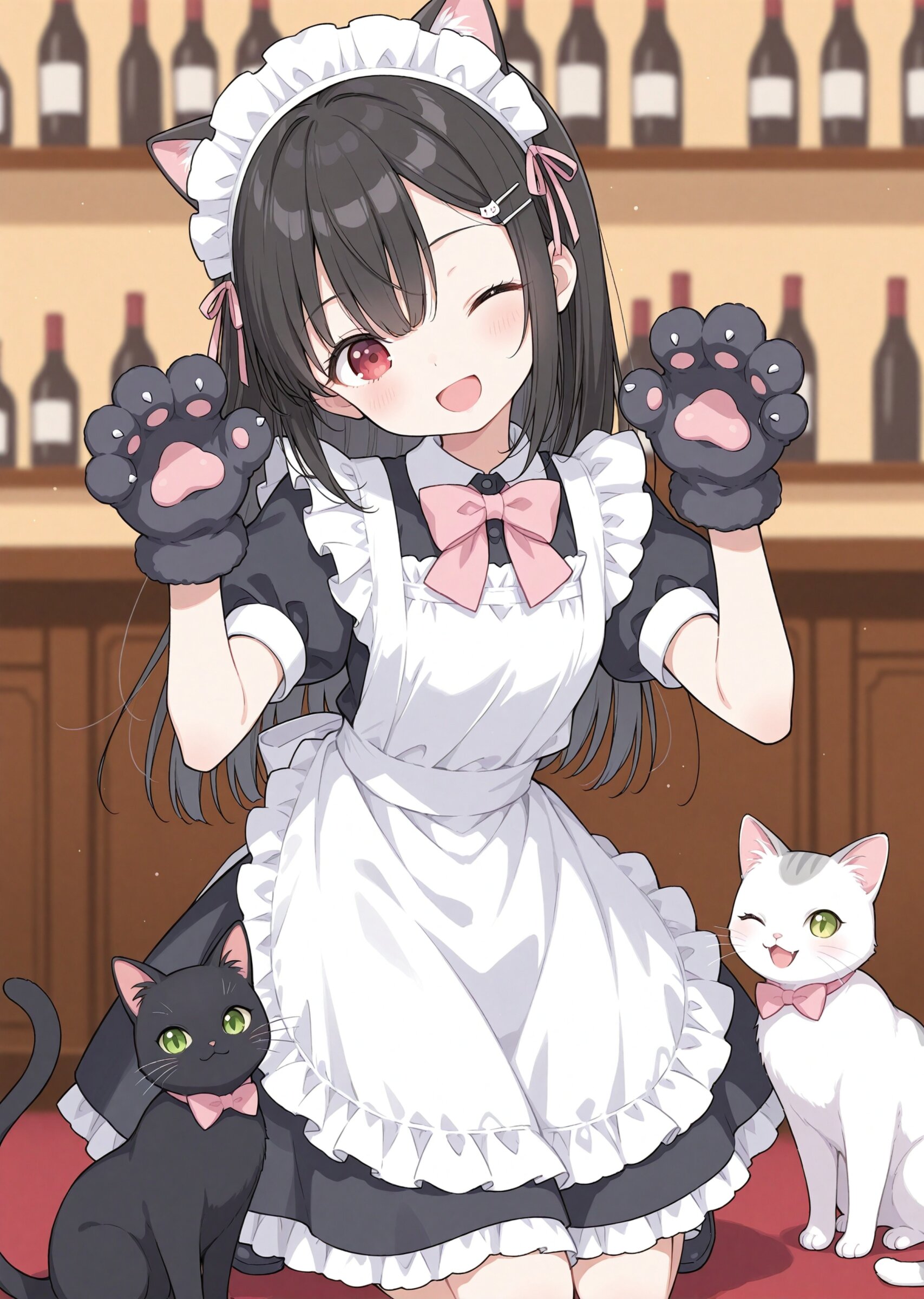 (flat color:0.1),(pale color:0.1), (tareme:0.33), cute 1girl , ruby eyes,one eye closed, straight hair ,black hair ,bangs between eyes,center flap bangs,(swept bangs:0.7), hairpin,kawaii, (pastel theme :0.1), (depth of field:1.3), blurry background, (bokeh:0.5),;d, (head tilt:1.3), BREAK (cats ,claw pose :1.1),(playful cats:1.3),black cat and white cat, paw gloves, kneeling,cat, hands up,hair ribbon, pink bowtie,black maid dress, maid apron, refined ,maid headdress, puffy short sleeves, bar \(place\), indoors, (contrapposto:0.7),(from side:0.6),pigeon-toed
