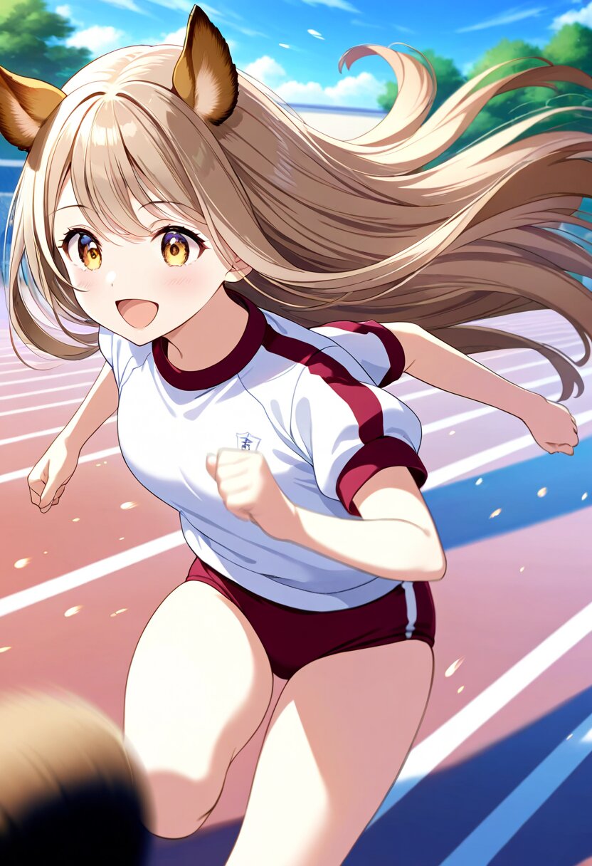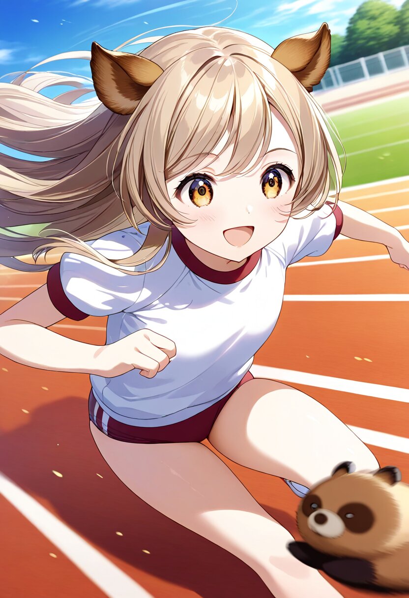 masterpiece, 1girl, solo, light brown hair, long hair, amber eyes, wild boar's ears, school gym uniform, buruma, half sleeves, running, smile, open mouth, 1tanuki running:1.6, school yard, blue sky, motion blur, depth of field, F1.4 lens, speed effect,
