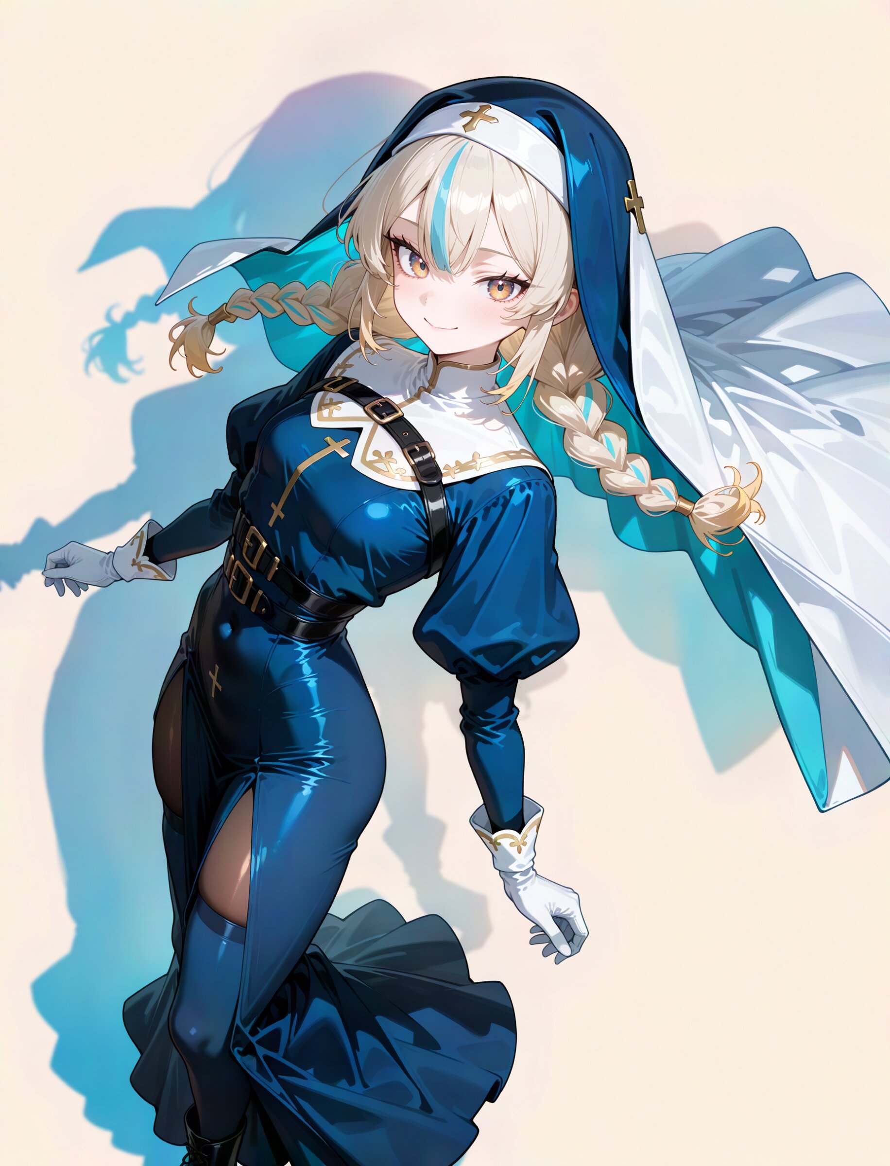 from side, looking at viewer (face:1.0) aerial view, looking afar dutch angle, looking at viewer, (simple watercolor background:1.1), drop shadow, colored shadow, The background is a solid, bright platinum blonde, creating a striking contrast with the intricate, multi-colored design of the character, pop color background, (high saturation:1.2), summer coloring, 1girl, nun, beautiful detailed eyes, holy face, cool Elegant and sophisticated demeanor, (pale skin:1.0), skindentation, beautiful platinum blonde eyes, tsurime , bronze hair, skyblue streaked hair, highlights hair, long hair, twin braids fanged bangs topknot floating hair, first-rate female bodies perfect body beautiful small breasts wide hips, , solo, nun, Good texture coif, silver plain cape, , divine chasuble, puffy sleeves, the feel of silky, , belt buckle, chest belt, , white laced gloves, , high-waist skirt, long skirt, blue thighhighs over pantyhose, boots, shiny smile, laughing, troubled face, closed eyes, closed mouth, adjasting hair super fine concept art, 8K, graceful eyes, masterpiece, best quality, amazing quality, very aesthetic, absurdres, newest, professional art lots of details, , overexposure, shiny-glistening, (watercolor style:1.0), (pastel color style:1.0) <lora:noline (1):-0.5> <lora:sdxl2-flat2-512b:0.2> <lora:facelightup_xl_v10:0.5>
