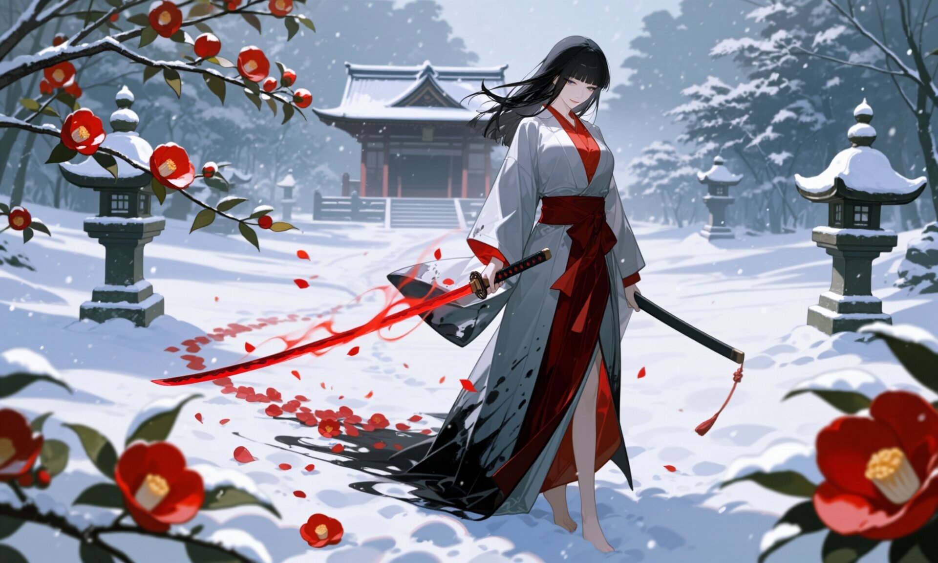 In a silent snow-covered field, a beautiful woman stands draped in a long, flowing pale grayish-white kimono that brushes the untouched snow. The hem of her kimono is stained as if ink has spilled, softly melting into the white world. Her straight, jet-black hair falls smoothly down her back, left unadorned, letting her natural beauty stand out. Her bare feet press lightly into the snow, leaving only the faintest marks behind. In her left hand, she holds a crimson-glowing cursed katana pointed downward. No liquid drips from the blade — instead, a faint crimson aura wraps around it, scattering red camellia petals into the cold air. On the snowy ground behind her, vivid red camellia petals and a whole 5-6 camellia flowers lie scattered, forming a shape that resembles a pool of blood — but it is not blood; it is only petals and blossoms resting quietly in the snow. Her half-lidded eyes carry a subtle, dangerously alluring smile, tempting the viewer into her hidden darkness. A deep red sash tied at her waist flutters gently in the drifting snow, adding a vivid contrast to her pale, ink-tinted kimono. She fills most of the frame, her presence undeniable and captivating. Behind her, an old, weathered temple fades softly into the snowy mist, with moss-covered stone lanterns hinting at a forgotten sacred place. In the lower right and left corners, a few camellia branches peek into view, their vivid blossoms softly framing her in a final whisper of warmth.