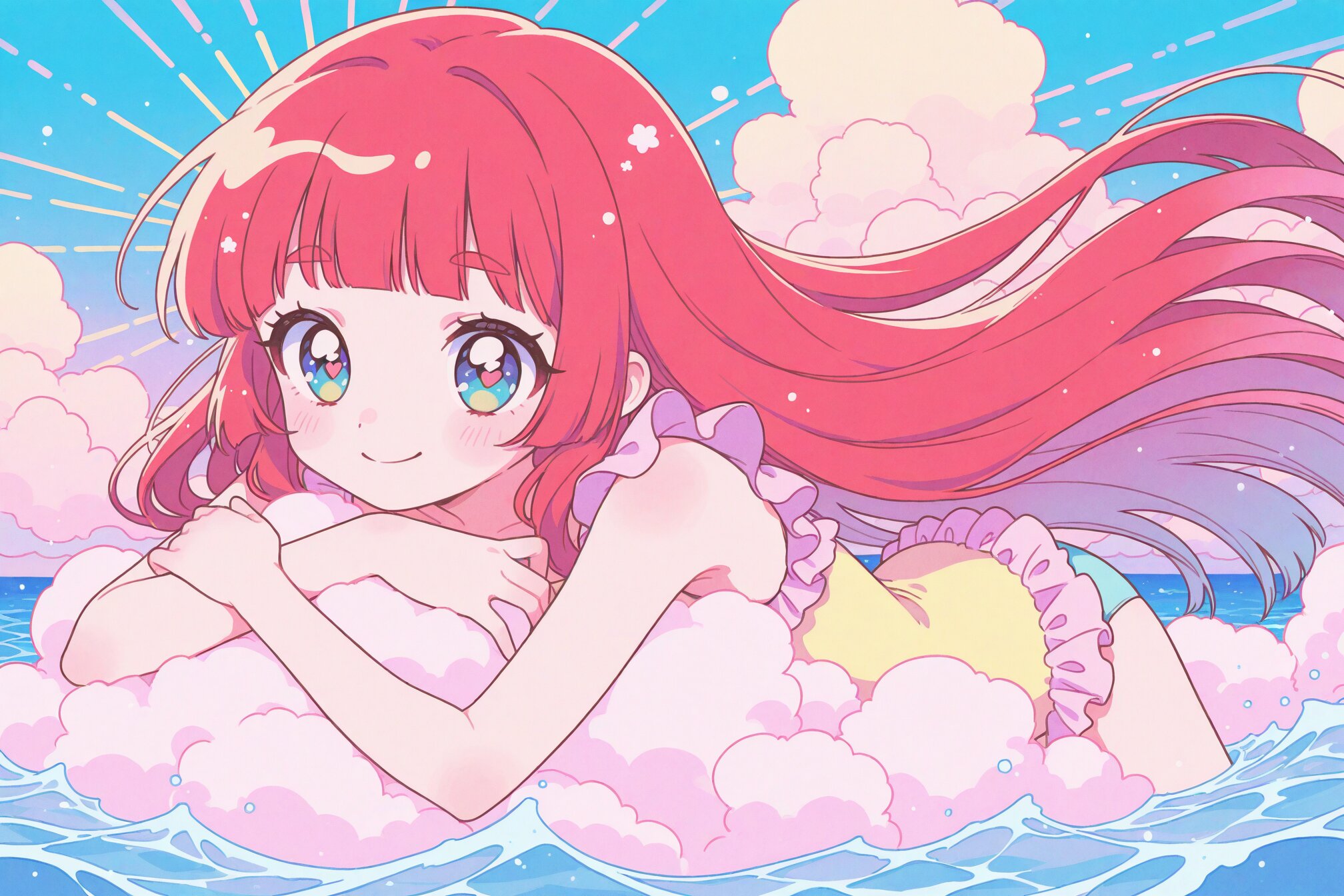 red hair(sky blue gradient eyes)Very long hair,straight hair,hime_cut,Beautiful Hair ((best quality))cute style, aesthetic, soft colors, pastel colors, kawaii style, kawaii pastel, cute forms, kawaii accessories, retro style, colored lineart, colored outline, pastel_colors, ,elongated eyebrows, 1girl, ,dreamy girl,yumekawaii,,shojo manga,smiling,close-up kawaii face, A dreamy cute girl swimming in the ocean, pastel-colored frilly swimsuit, glittering sea, magical sparkles in the air, fluffy clouds shaped like hearts, soft lighting, kawaii aesthetic, fantasy summer vibe, anime illustration,sunburst background, yellow and red, sun
