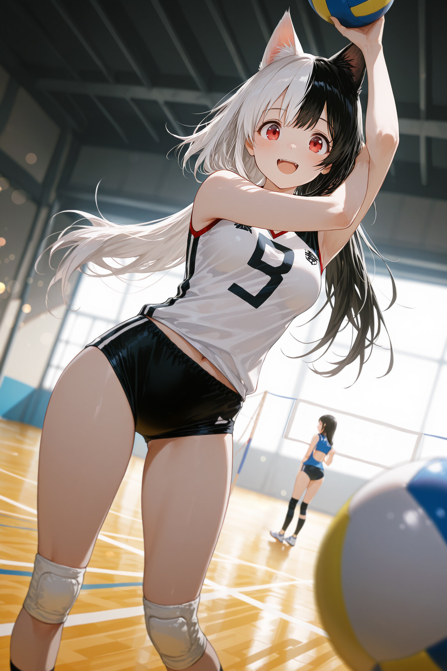 masterpiece, best quality, absurdres, 8k, ultra detailed, aesthetic, very aesthetic, newest, <lora:Fixhands_anime_bdsqlsz_V1:0.5><lora:bold-16oa:-0.5> (realistic:0.3),BREAK (bokeh,shallow depth of field,Gaussian Blur:1.6),(tareme:1.3), blue volleyball uniform,sneakers, indoors,ground, school yard,(volleyball:1.4),dutch angle,playing volleyball,students,net,receive,playing volleyball, (beautiful two-colored hair in black and white long hair,beautiful red eyes,cat ears:1.2),(looking at viewer:1.2),(happy:1.4),open mouth,(Split-Color Hair,black and white long hair:1.3),fullbody shot,from front,(medium breasts,curvy:1.3)<lora:USNR STYLE_XL_loha:0.8>