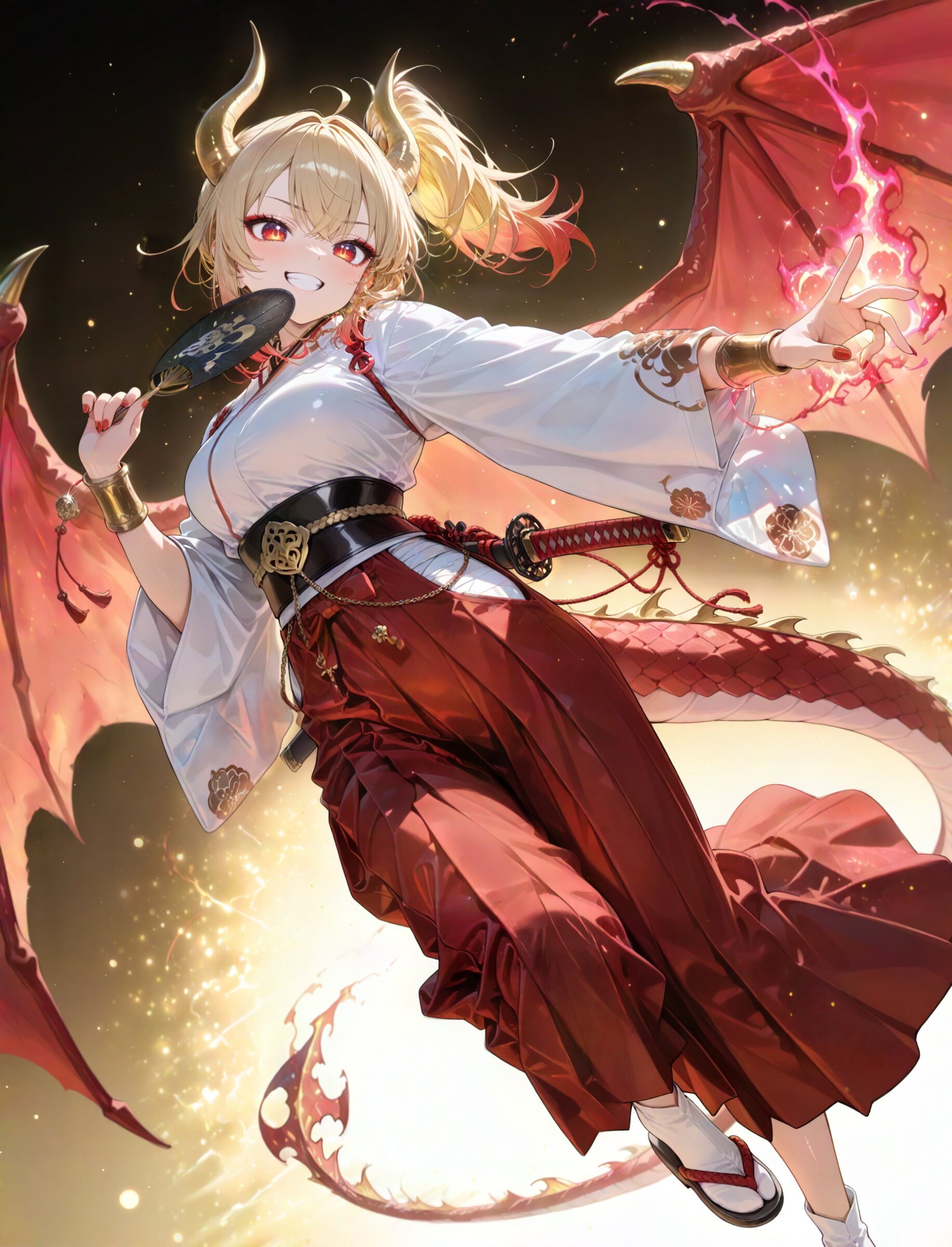 super fine concept art, hard surface, 8K, masterpiece, best quality, amazing quality, very aesthetic, absurdres, from behind, thrust out one's hip, looking another, (character focus:1.1), knees out of frame , (dutch angle:1.2), The silhouette is composed of dynamic, vibrant whorl. The background is a solid, creating a striking contrast with the intricate, multi-colored design of the character, summer atmosphere. 1dragon girl, solo, dragon girl, 18yo, (2dragon gold horns attached to the head:1.2), (blonde hair:1.2) medium hair half updo hair up (side ponytail:1.3), red eyes beautiful iridescence eyes, (eyeshadow:1.2), cute, beautiful, (muscle,buff well-built body,ultra-detailed muscle:0.6) , first-rate female bodies perfect body framed breasts smart hips Average height, red nail polish, a dragon tail (2long red dragon wings on back:1.2), (red hakama:1.0) (overskirt:1.0) (White Japanese Clothes:1.0), sarashi inner, (White wide sleeve:1.0) gold and white stripe obi, bracer, straw sandals, tabi, (shiny smile), clenched teeth, eye trail,, glowing japanese sword, (japanese sword action:1.0), katana swing out glint, leg up v over mouth, (swirling red energy,energy magic,energy:1.2), glowing eastern dragon red aura, (swirling black ink effects:1.2) dynamic action, , black motion blur, The background is a solid, bright maroon, creating a striking contrast with the intricate, multi-colored design of the character, (dancing silhouette:0.0), pop color background, (high saturation:1.2), summer coloring, partly black ink wash effect, professional art lots of details, , overexposure, shiny-glistening, (watercolor style:1.0), (pastel color style:0.0) 4ur4_illu,shiny, glowing, glowing particles, glowing light particles, light particles, maroon holding fan, uchiwa , <lora:noline (1):-0.5> <lora:sdxl2-flat2-512b:-0.3> <lora:facelightup_xl_v10:0.5> <lora:V2_yakumo_alchemy:0.4> <lora:Aura_illu:0.2>