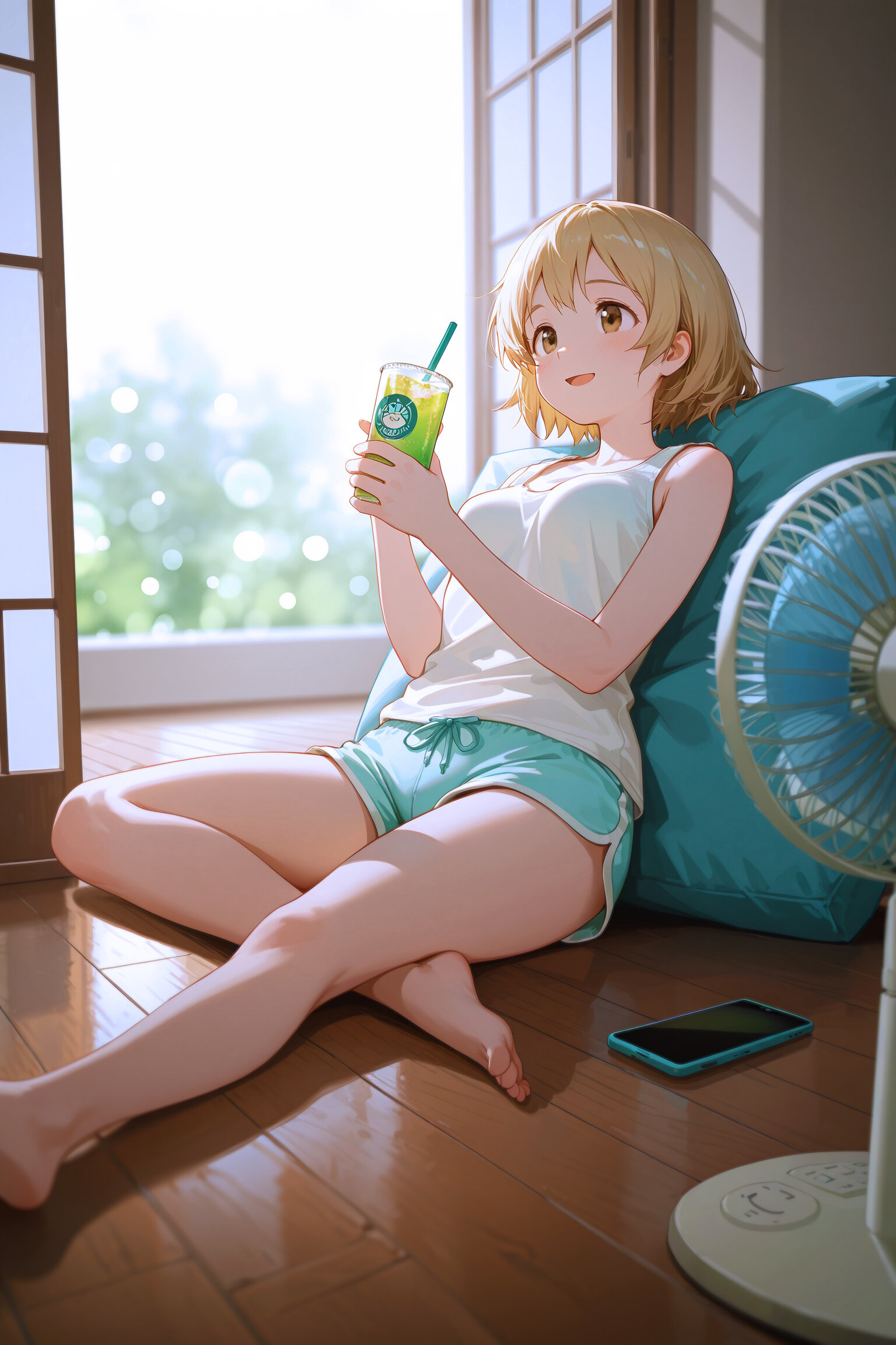 masterpiece, best quality, absurdres, 8k, ultra detailed, aesthetic, very aesthetic, newest, <lora:Fixhands_anime_bdsqlsz_V1:0.5>, <lora:bold-16oa:-0.5>, (realistic:0.3),BREAK (bokeh,shallow depth of field,Gaussian Blur:1.1). ,(1woman, loungewear, summer indoors, relaxing, sitting on floor, holding cold drink, electric fan, sunlight streaming through window, sleeveless shirt, shorts, bare feet, natural smile, cozy room, casual summer outfit, peaceful atmosphere, wooden floor:1.3), summer,girls room,jersey pajama,lying,smartphone,relax, (brown eyes, blonde hair,short hair:1.2),(tareme:1.3),open mouth,fullbody shot, (medium breasts,curvy:1.3), <lora:USNR STYLE_XL_loha:0.8>