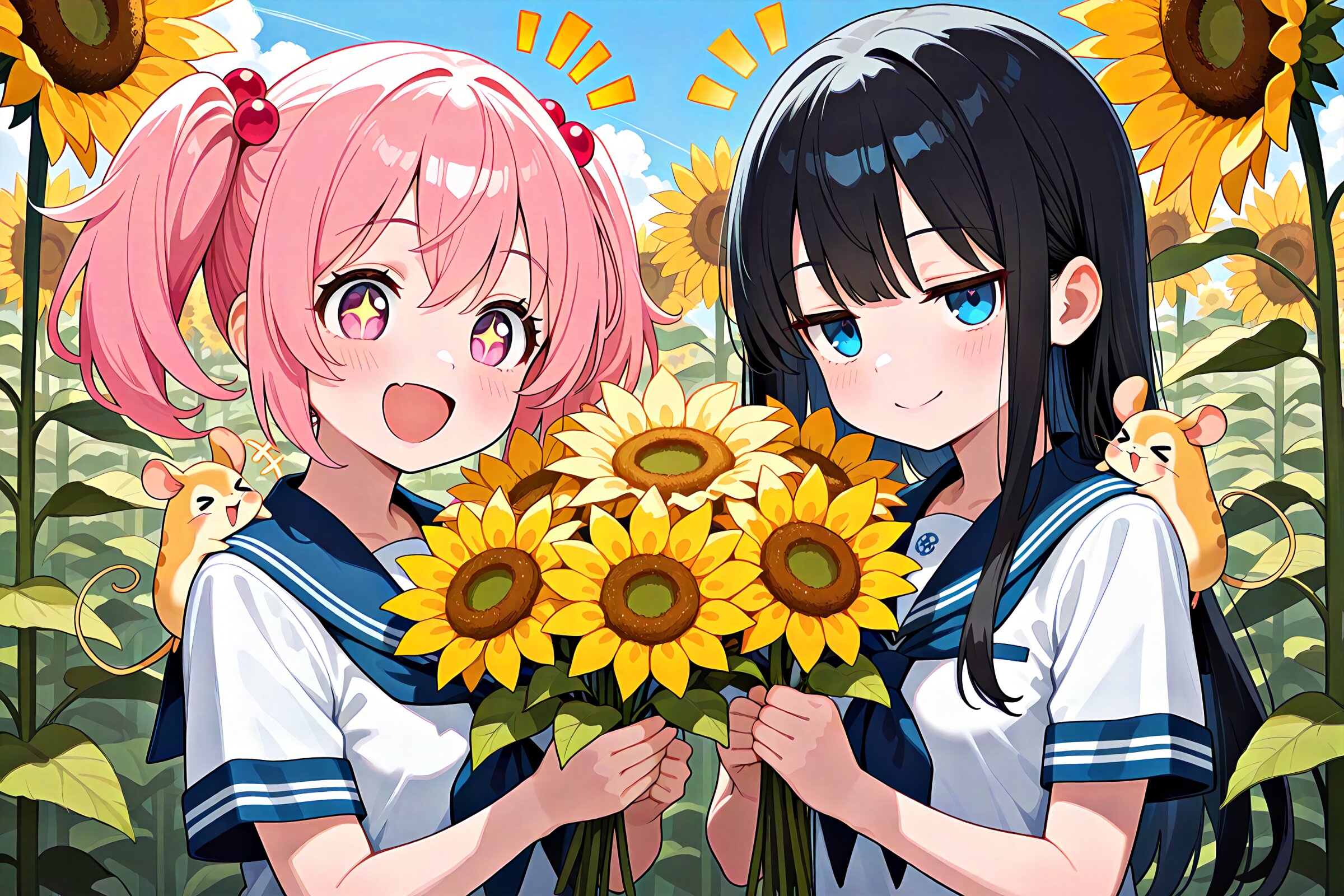 2 little girls, solo, symmetrical pose, upper body, masterpiece, best quality, amazing quality, very aesthetic, pink hair, twintails, pink eyes, +_+, open mouth, smile, cheerful, +++, notice lines, (hamsters on her shoulders:1.2), > <, serafuku, holding a flower bouquet, dynamic pose, in sunflower field, summer, BREAK 2 little girls, solo, symmetrical pose, upper body, masterpiece, best quality, amazing quality, very aesthetic, 14yo, Petite, loli, small breasts, black hair, long hair, blue eyes, jitome, closed mouth, smile, cheerful, +++, notice lines, (hamsters on her shoulders:1.2), > <, serafuku, holding a flower bouquet, dynamic pose, in sunflower field, summer,