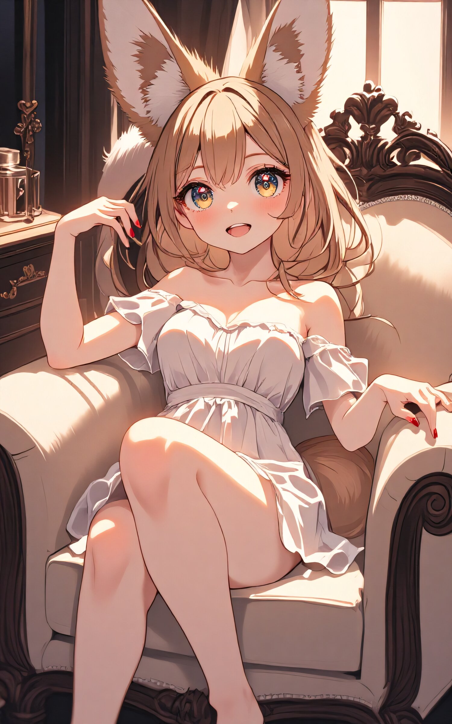 anime style, high resolution, full body, fox-eared girl, long light brown hair, double eyelids, long delicate eyelashes, fluffy fox tail, fierce sharp fangs, vivid red nail polish, wearing a flowing white one-piece dress, relaxing on a vintage sofa, soft lighting and cozy atmosphere, gentle smile with hidden wildness, fantasy slice of life