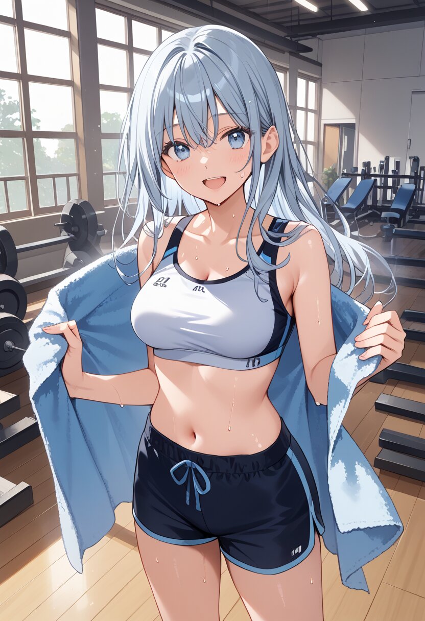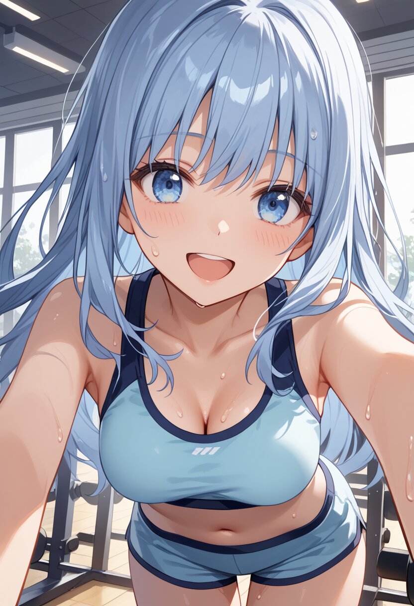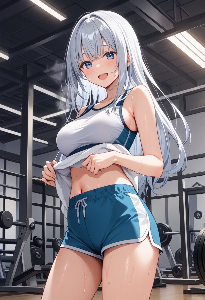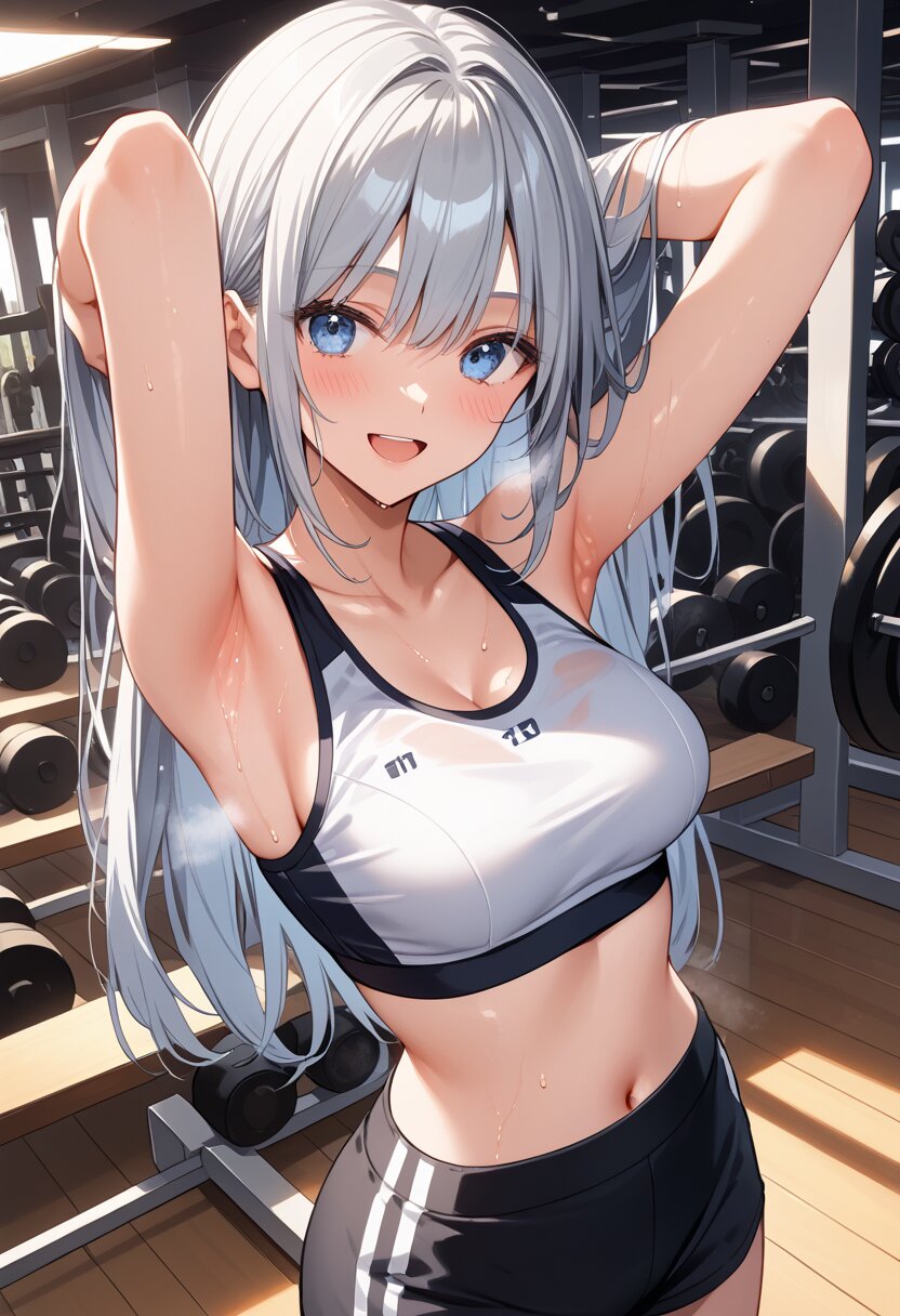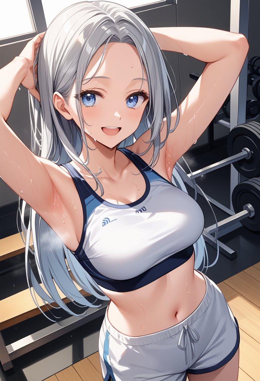 score_9,score_8_up,score_7_up,source anime,best quality,masterpiece,8k,extremely detailed CG unity 8k wallpaper,dynamic_angle,close-up,1girl,gym,silver long hair,<lyco:sport bra_illustrious_V1.0:1>,medium breasts,blue eyes,sport bra,(steam:1.1),sweating,kind_smile,happy,black shorts,Slightly_open_mouth,standing,arms_up,(armpits:0.9),blush,slender,