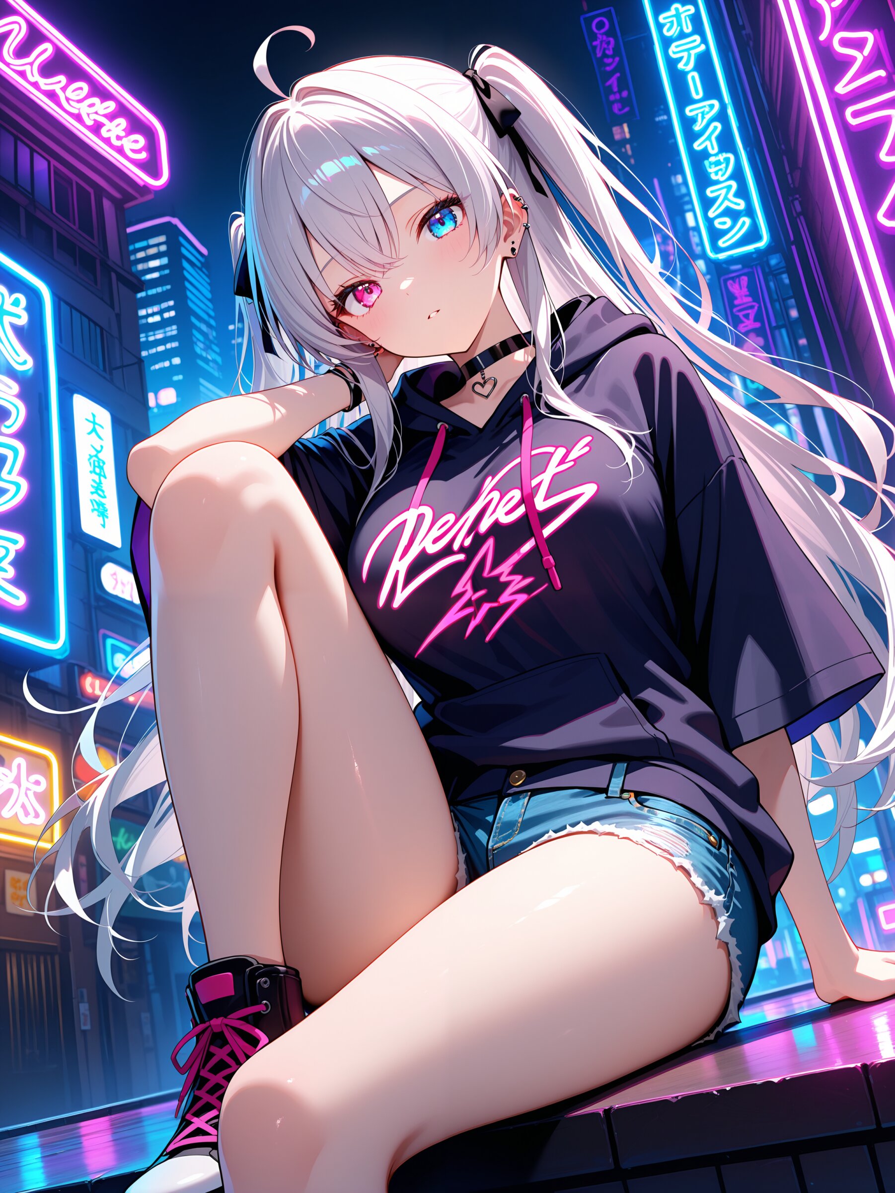 hoodie, short sleeves, wide sleeves, shorts, denim shorts, choker, ear piercing, cap, city, (neon, neon lights:1.3), dark, sitting, knee up,
