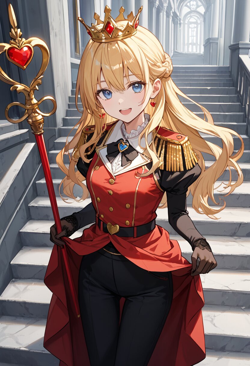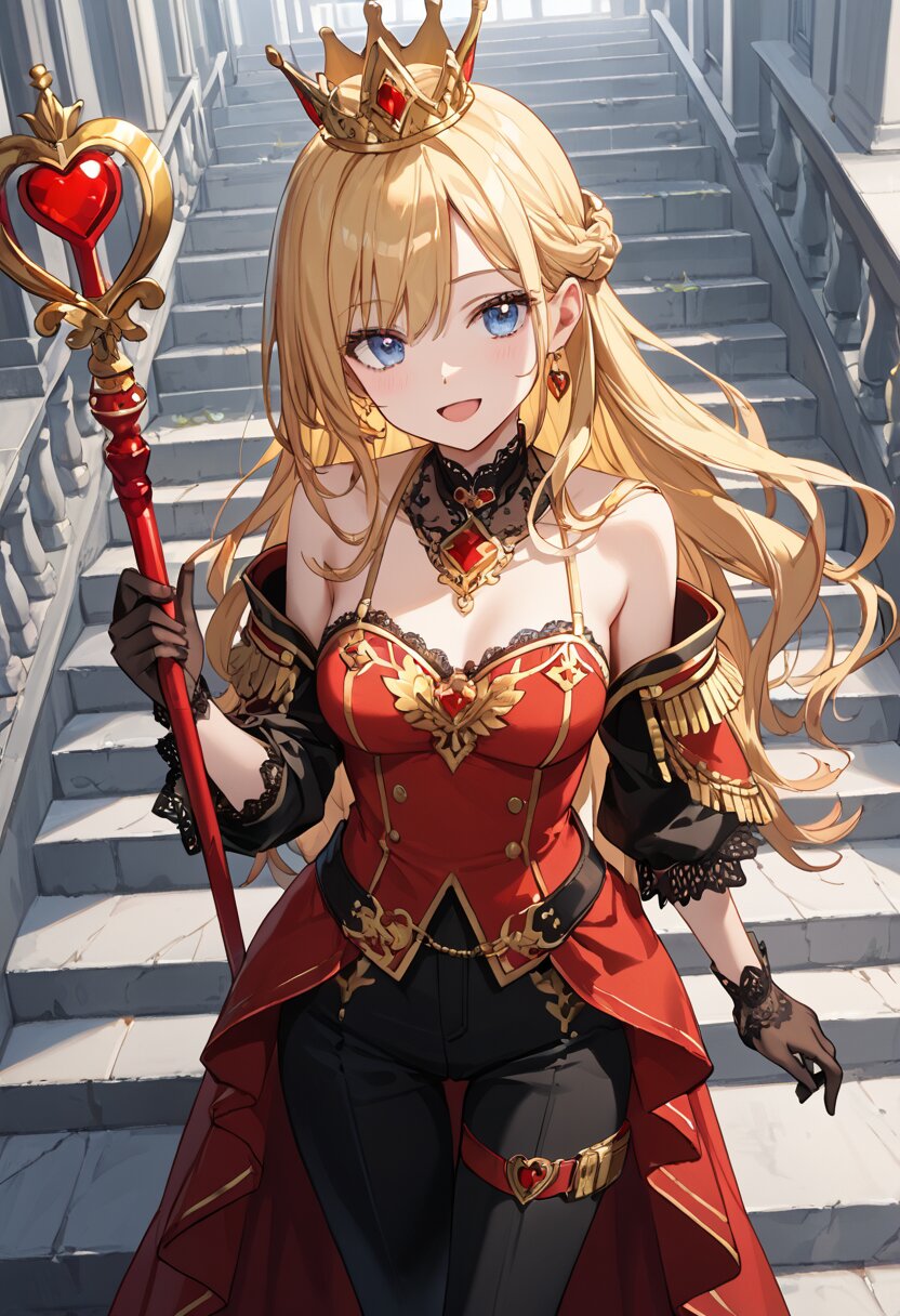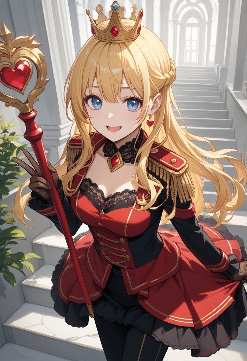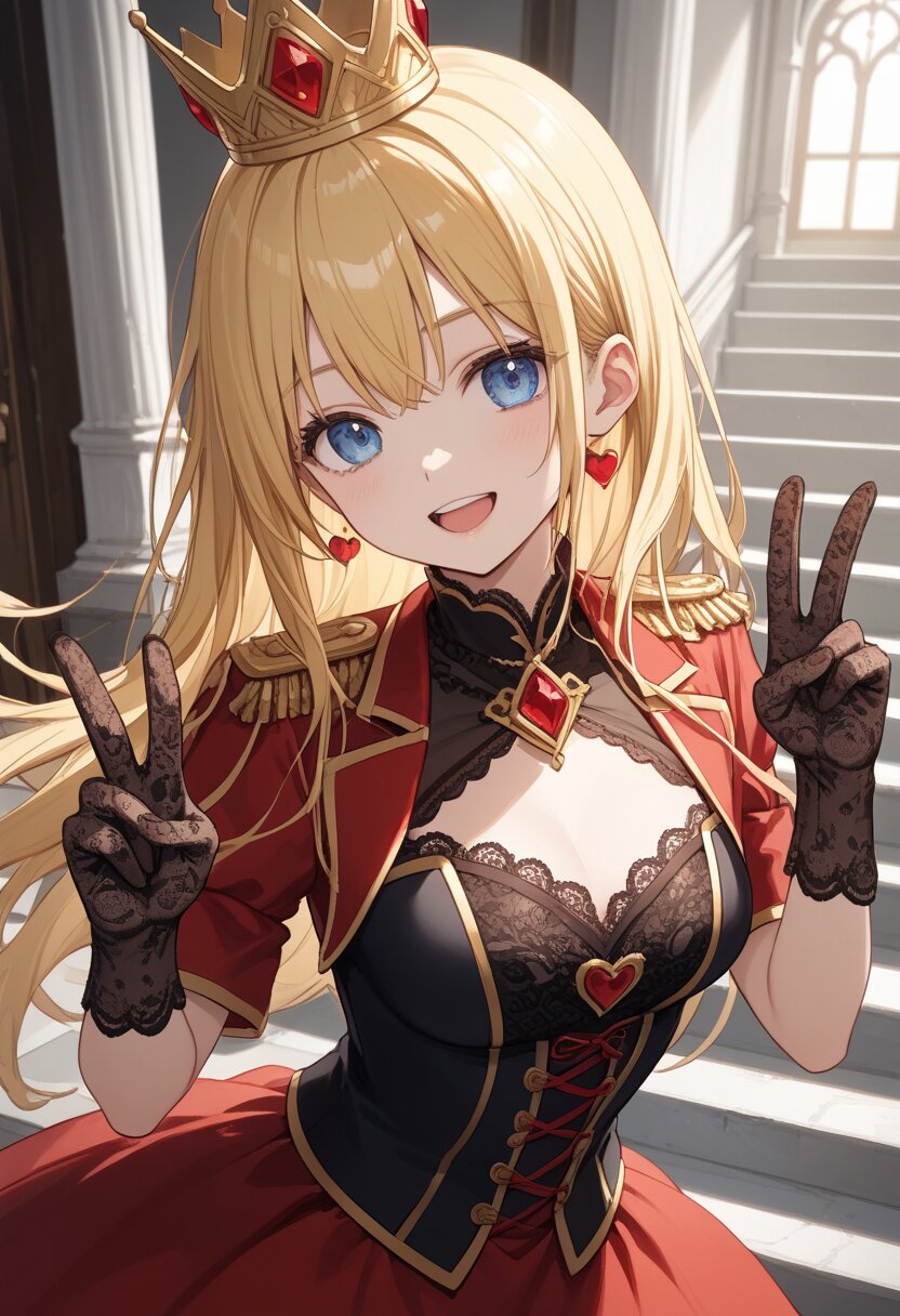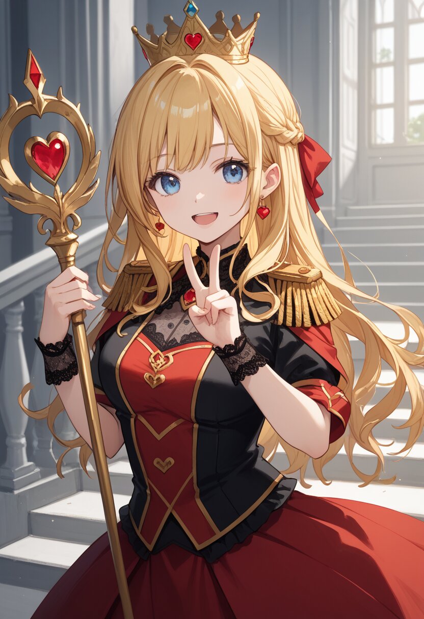 score_9,score_8_up,score_7_up,source anime,best quality,masterpiece,8k,extremely detailed CG unity 8k wallpaper, BREAK (close-up:1.3),(dynamic_angle:1.1),depth of field,face_focus,stairs,crown,(elegant queen of hearts gown:1.1),heart emblems embroidered,puffed shoulders,layered red and black fabric,golden epaulettes,lace gloves,yellow long hair,blue eyes,smile,Slightly_open_mouth,taut_clothes,(multiple red accessories on clothes:1.1),sacred,red skirt,v,