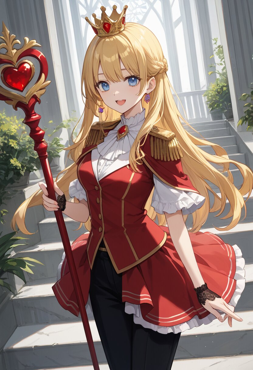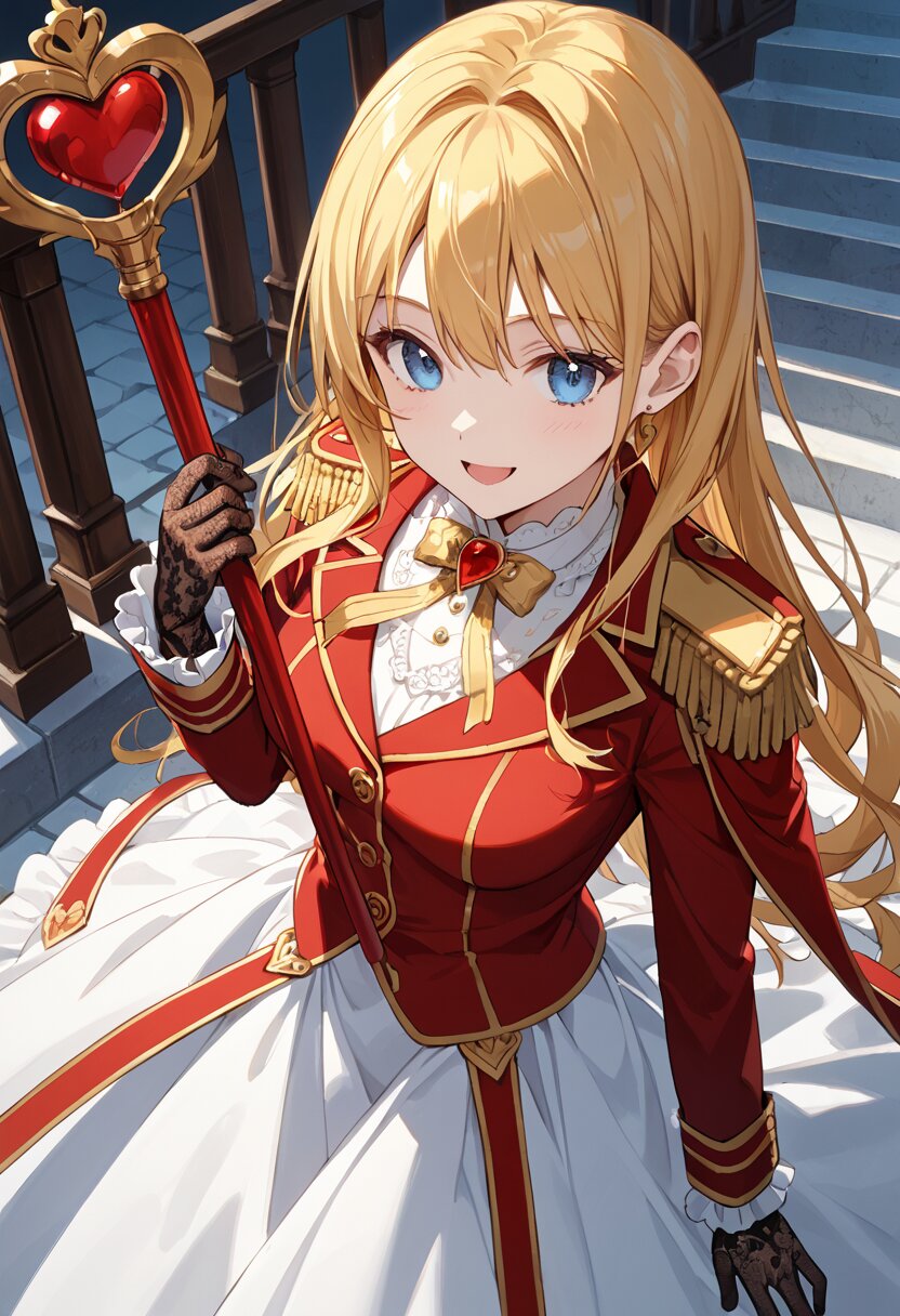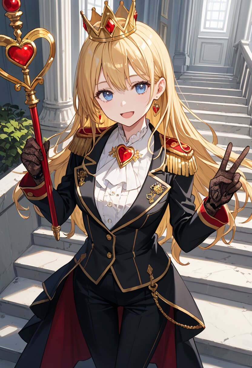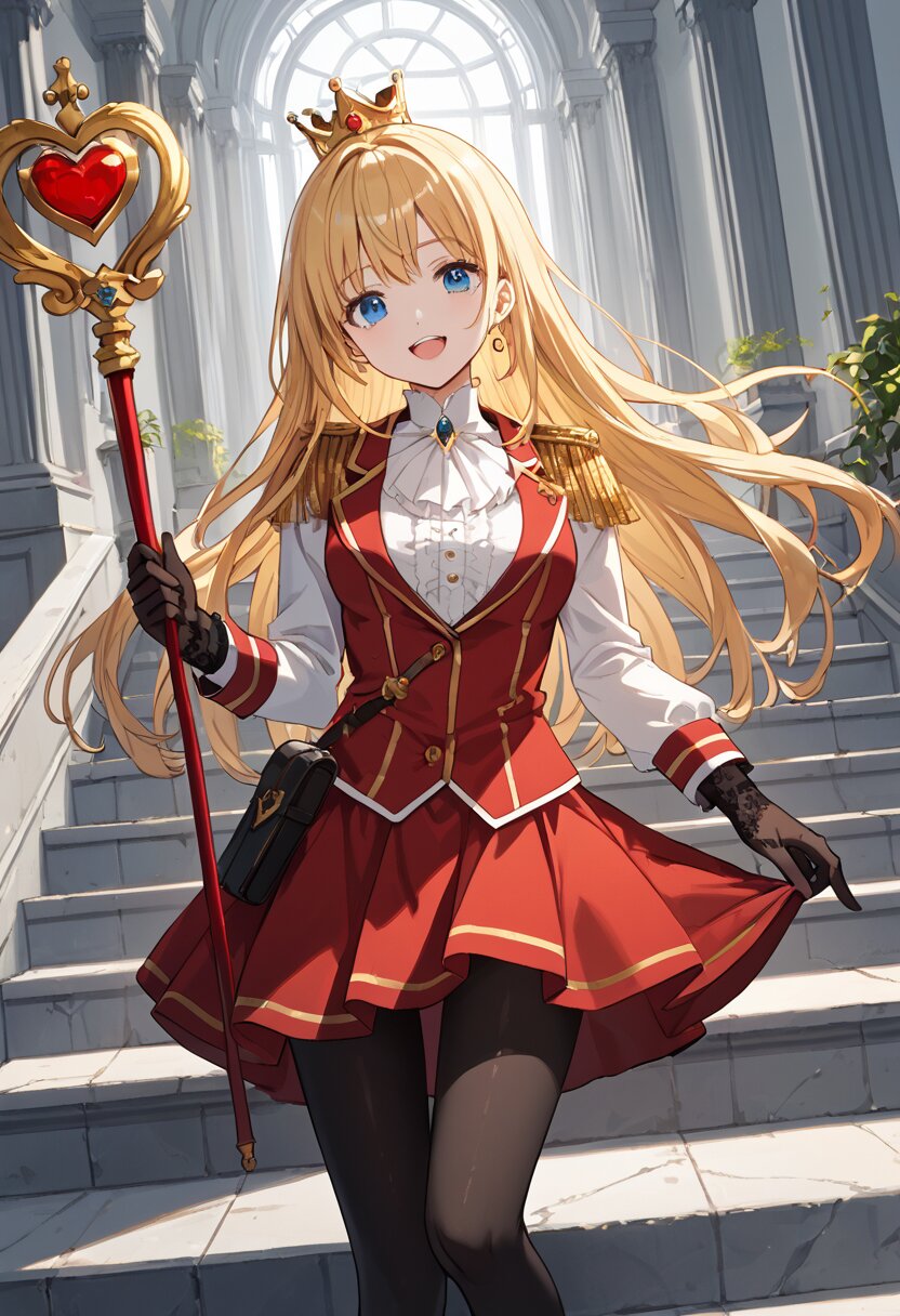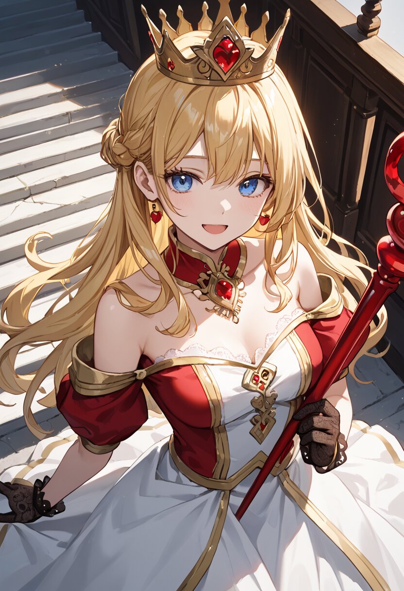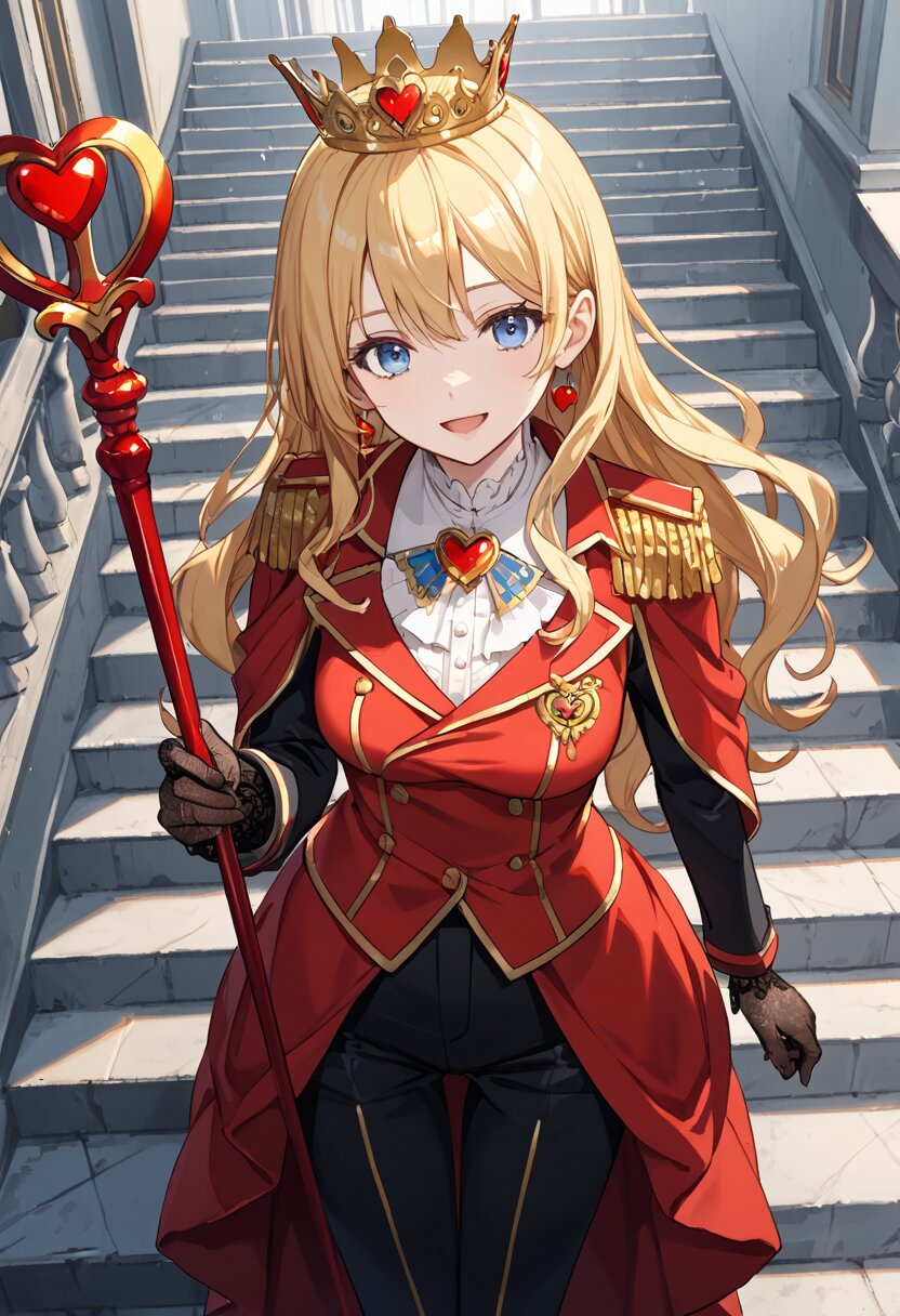 score_9,score_8_up,score_7_up,source anime,best quality,masterpiece,8k,extremely detailed CG unity 8k wallpaper, BREAK (close-up:1.3),(dynamic_angle:1.1),depth of field,face_focus,stairs,crown,(elegant queen of hearts gown:1.1),heart emblems embroidered,puffed shoulders,layered red and black fabric,golden epaulettes,lace gloves,yellow long hair,blue eyes,smile,Slightly_open_mouth,taut_clothes,(multiple red accessories on clothes:1.1),sacred,red skirt,v,