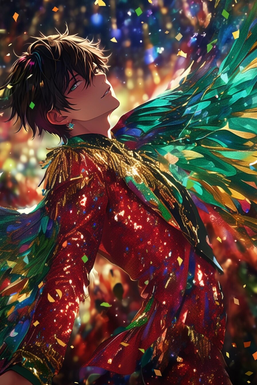 anime style, high quality, ultra-detailed, 8K, masterpiece, a breathtakingly beautiful young man with short black hair and long eyelashes, he wears a sparkling sequin suit in vibrant colors (turquoise, emerald, gold), designed to shimmer under the lights, his back is adorned with enormous feathered wings in vivid hues, swaying as he dances samba, the scene is set in the Rio de Janeiro Carnival parade, with a dazzling and festive background, confetti fills the air, bright lights reflect on his suit, music and motion captured mid-dance, his expression is joyful, free, and full of energy, dynamic pose, emphasizing elegance and movement, background includes parade floats, dancers, and an electric festival atmosphere