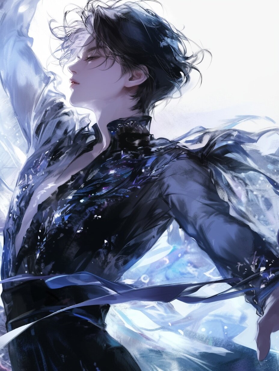 Delicate and careful illustrations, fine lines, young man, Figure skating, beautiful blue costume, romantic style, high quality,skating rink