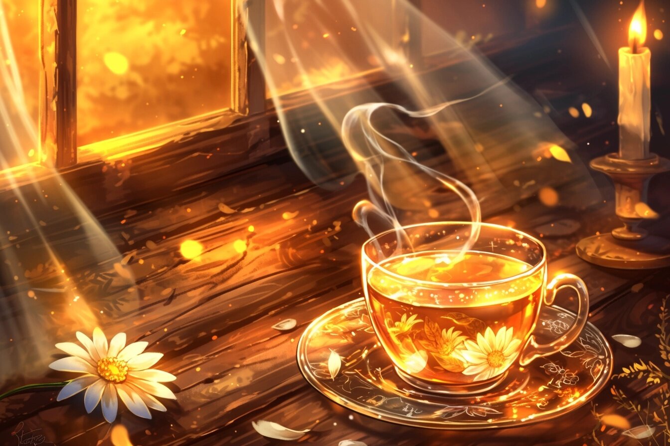 (masterpiece, best quality, ultra-detailed, anime-style, soft lighting), a **delicate glass teacup** filled with warm, fragrant **herbal tea**, light reflecting through the transparent liquid, creating a gentle glow, an **elegant wooden table**, adorned with a softly flickering **aroma candle**, its **warm flame dancing subtly**, casting soft shadows across the surface, placed near a **sunlit window**, where golden daylight pours in, a sheer, lightweight **curtain swaying gently in the breeze**, the scene exuding an atmosphere of **calm, relaxation, and warmth**, tiny details like **delicate tea steam rising, the flicker of light on the table, and floral patterns on the cup**, evoking a sense of **tranquility, comfort, and peaceful solitude**.