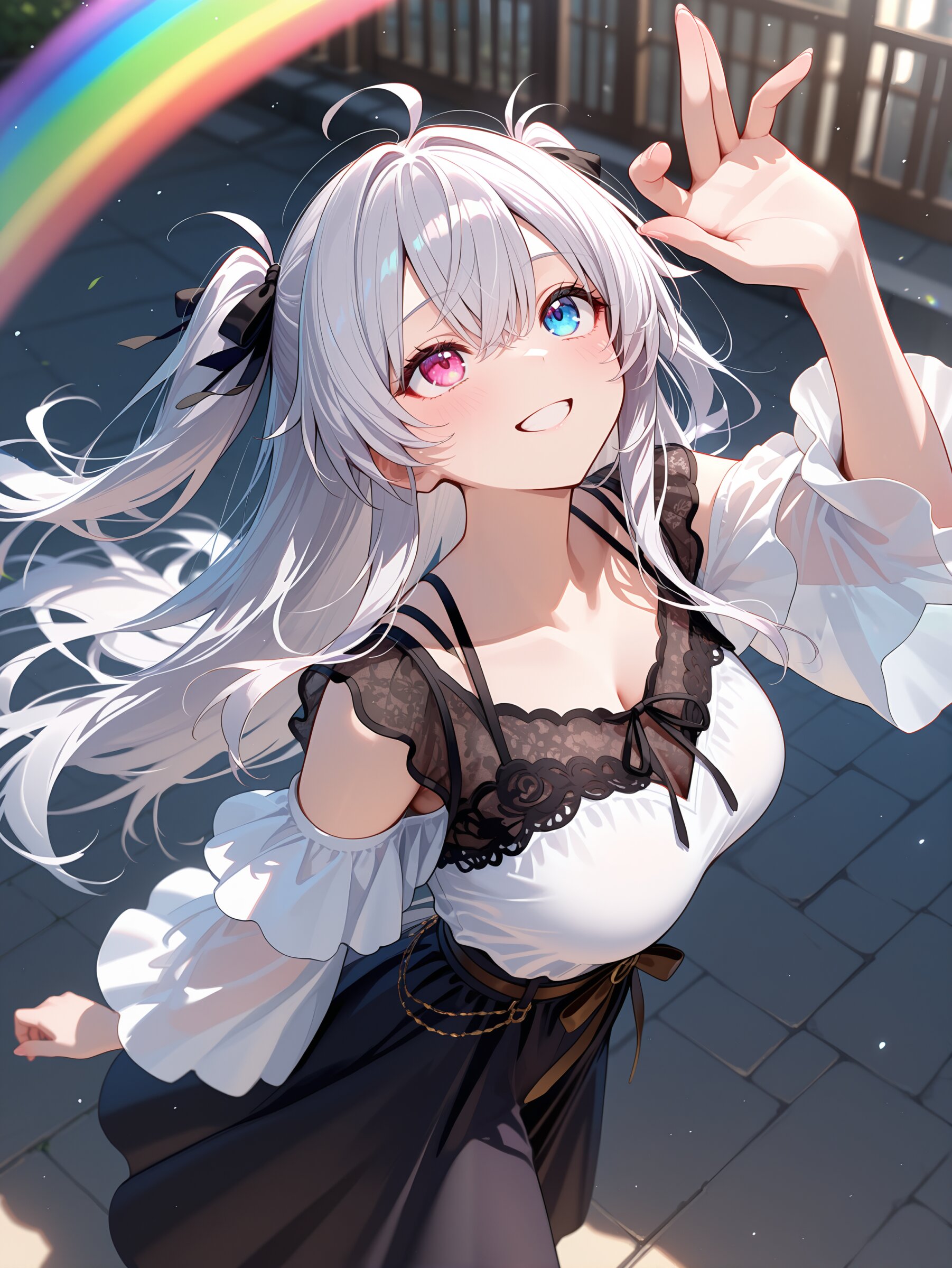 casual fashion, layered sleeves, looking up, smile, rainbow,