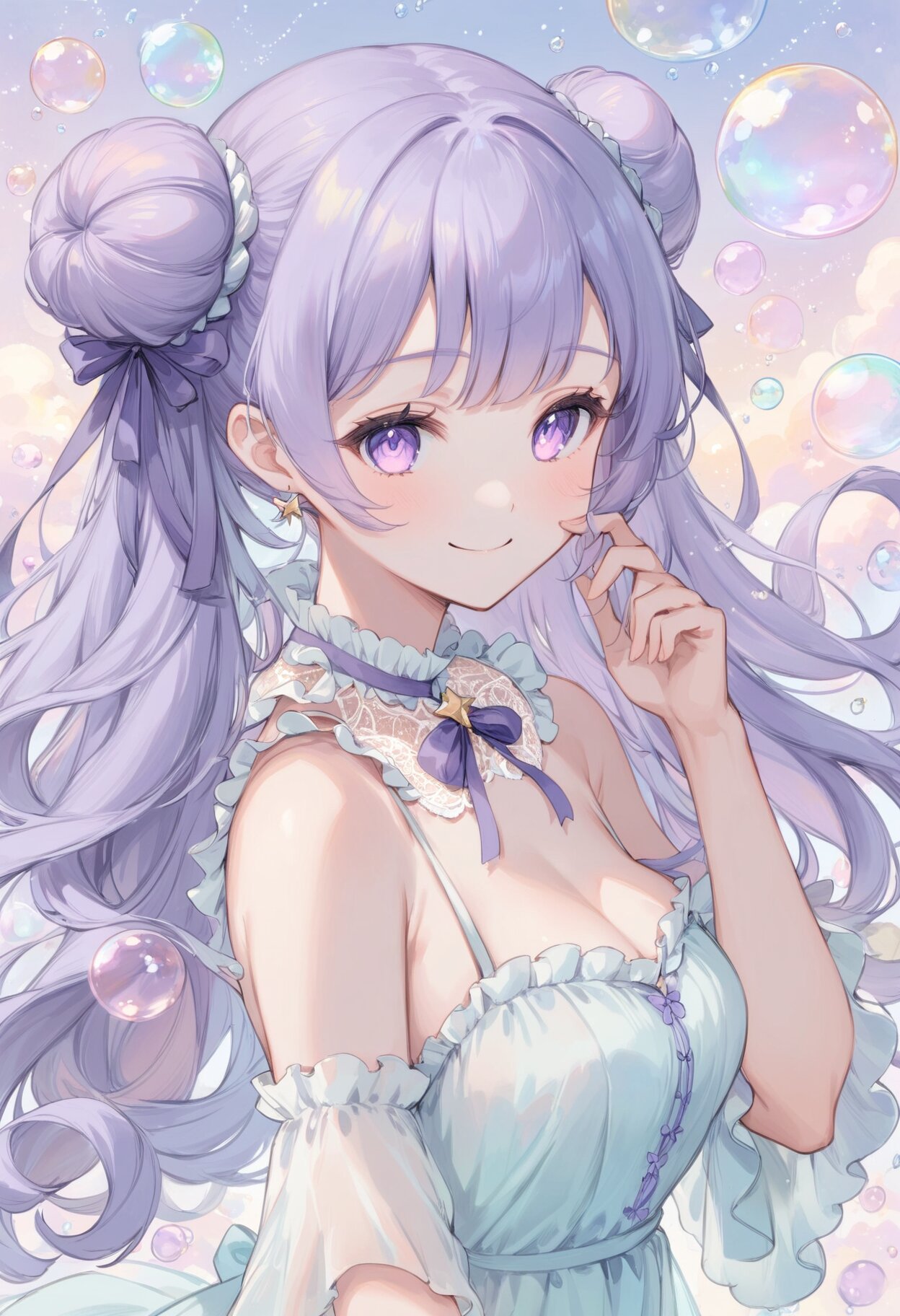 masterpiece, best quality, solo, upper body, cute anime girl smiling softly, calm and relaxed posture, one hand gently brushing hair behind ear, pastel one-piece dress with frilled french sleeves and lace collar, soft lavender ribbon at neckline, light chiffon texture, soft breeze flowing through her long silky purple hair with light blue inner highlights styled in twin buns, sparkling purple eyes filled with serenity, surrounded by drifting pastel bubbles and glowing jellyfish-like shapes, faint sparkles in the air, ambient pastel sky background with floating translucent petals, soft warm lighting from the side, dreamy fantasy atmosphere, watercolor texture, pale pastel color palette, thin delicate lineart, matte finish, gentle shadows, subtle rainbow shimmer, fluffy textures, translucent details, heart and star motifs
