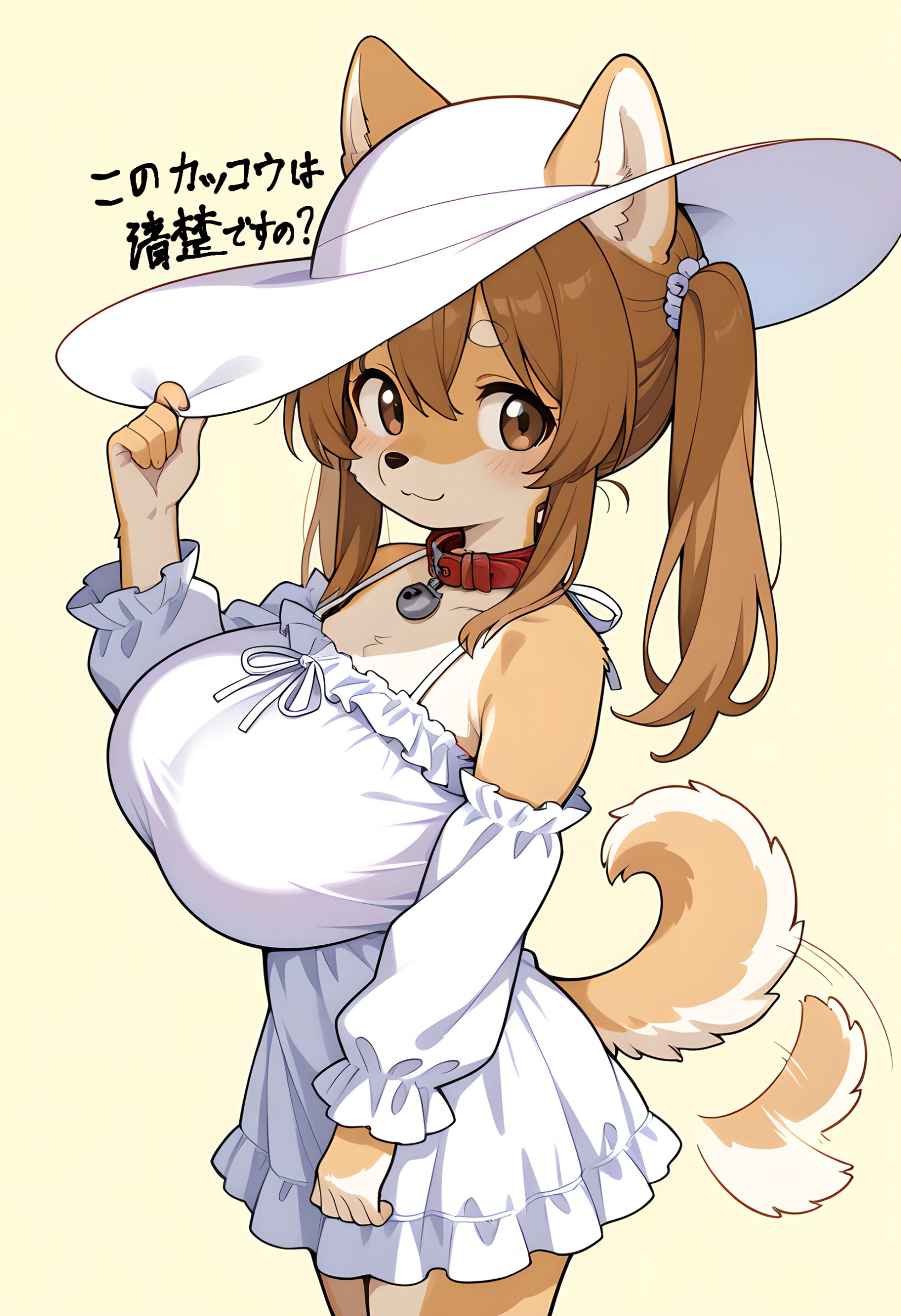 1girl,(loli),((very short)),short female,oppai loli,(dog girl),(shiba-inu girl),(furry female),(snout:1.3),shiba-inu ears,shiba-inu tail,body fur,curled tail,dog paws,(huge breasts),light-brown hair,long hair,long twintails,white thick eyebrows,hair between eyes,brown eyes,round eyes,white sunhat,ears through sunhat,animal collar,white sundress,frill-trimmed sundress,detached sleeves,frilled sleeves,smile,closed mouth,standing,hand on sunhat,hat tip,sideways glance,wagging tail,yellow background,cowboy shot,from side,hair shade,((low contrast)),(anime colored),(kawaii),softy,(2D),(cute),furry,(two tone fur),(furry body),perfect body,detailed face,high quality,cute clothes,animal tail,animal ears,solo,masterpiece,((correct_anatomy)),gddw,,pretty and cute, (chibi), masterpiece, comical, simple, smile, :3,anime, <lora:flat1:0.7> <lora:yawanuri:0.7>