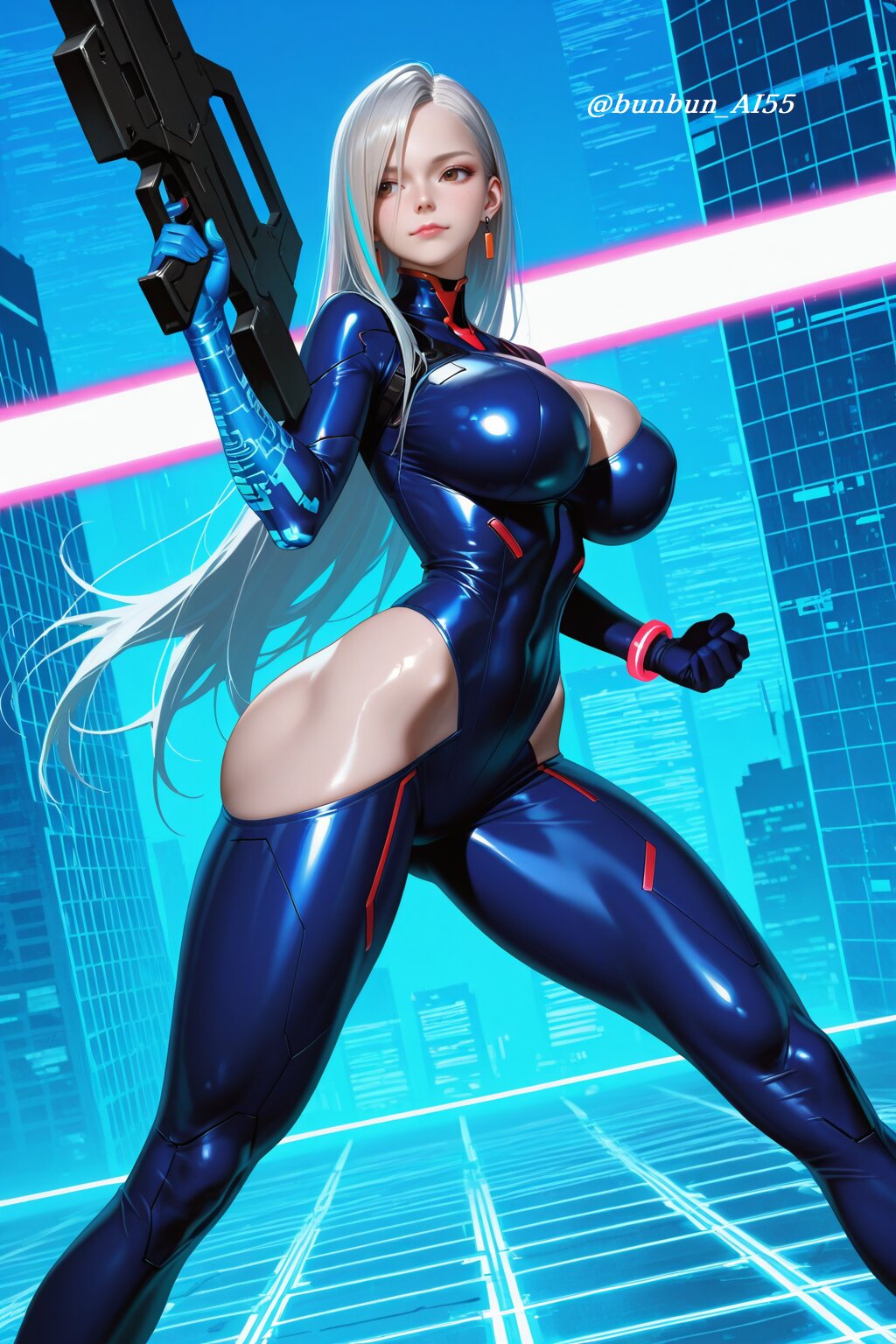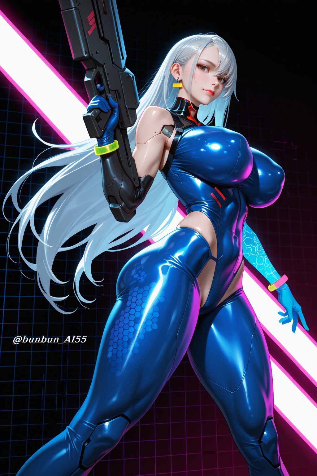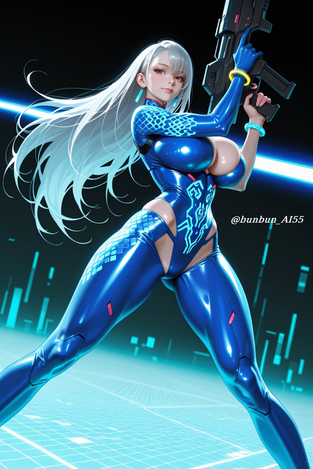 HDR, 8K,masterpiece, best quality, amazing quality, very awa, very aesthetic, absurdres, newest, detailed eyes, realistic eyes, realistic body, highres, add detail, sharp detailes, sharp lines, sharp focus, (realistic, hyperrealistic), sexy style, perfect anatomy, intricate details, high detail RAW color art, high contrast, digital painting, anime style, depth of field, (mechanical, futuristic, cyberpunk), an intricate illustration, BREAK perfect lighting, professional lighting, face lighting, (1girl, elegant beautiful woman:1.5, 21year old), (serious, sexy, model, cool beauty), (beautiful face, slim face, small face, cute face, detailed face, brown eyes, cyberpunk makeup, pink lips), (looking at viewer, alluring gaze, serious expression), BREAK nsfw, (pink very long hair with silver highlights, straight hair), (jewelry, piercing, earrings, bracelet), (huge breasts, pointy breasts), (long legs, thick thighs), (perfect hands), (shiny skin, glossy skin), (super model body:1.2, muscle body:1.2, slim body, athletic body:1.2), BREAK (wearing a sleek blue cyberpunk-style bodysuit with glowing white lines:1.5, asymmetrical arms and thighs and body cutout:1.2, asymmetrical design:1.2, intricate design:1.2), (blue latex gloves), (light reflections), (shiny, glossy, luster, latex), (tight fit), BREAK (standing, legs apart, dynamic pose, dynamic action pose, ready for battle pose, heroic pose, holding a gigantic beam rifle:1.3), (holographic geometric pattern, glitch background, digital grid), (face focus shot:1.3, medium shot:1.2, dynamic angle),