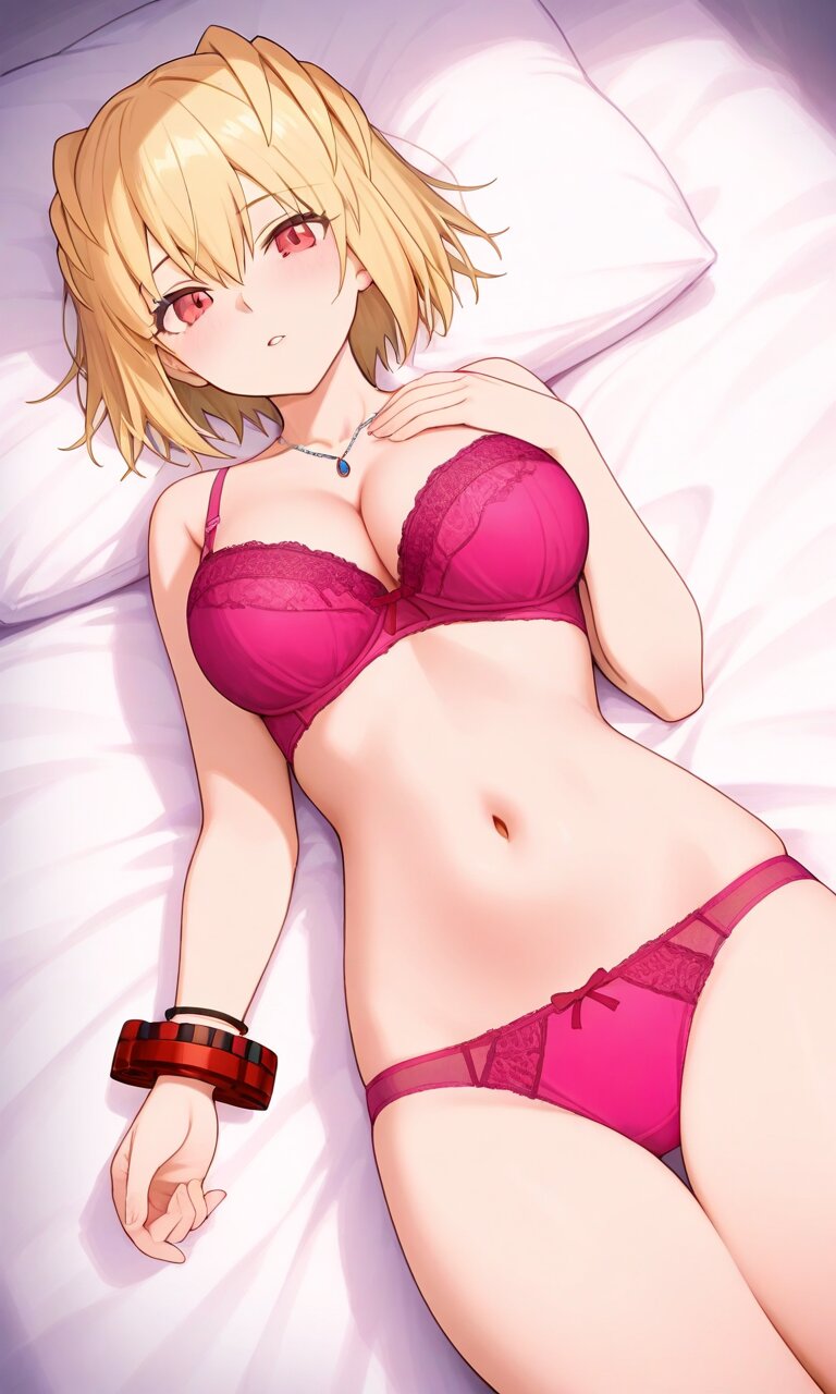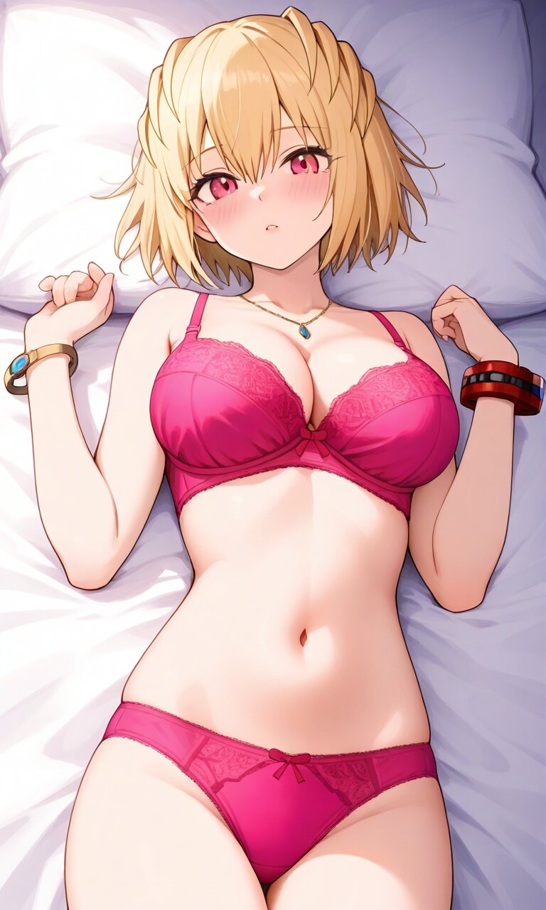 Claire Victorious, red eyes, short hair, blonde hair, red bracelet, large breaths this woman is laying on her stomach in a pink bra and panties, 1girl, solo, breasts, underwear, panties, lying, cleavage, on back,