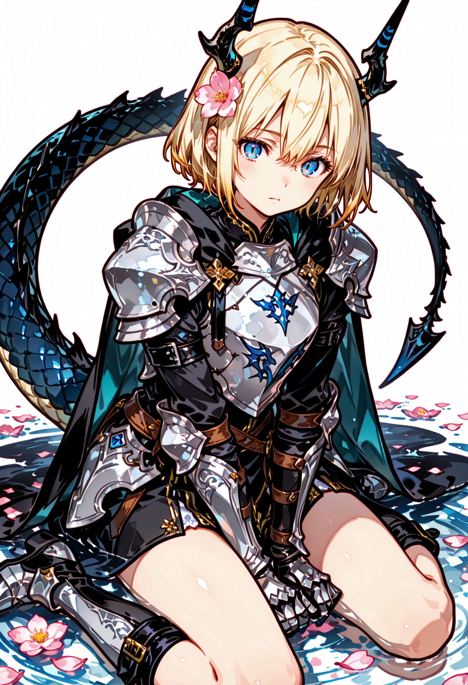 1girl, solo, looking_at_viewer, short_hair, simple_background, long_sleeves, hair_ornament, white_background, blue_eyes, dress, hair_between_eyes, closed_mouth, sitting, tail, full_body, blonde_hair, flower, thighs, boots, horns, hair_flower, blue_eyes, water, black_dress, cape, armor, petals, expressionless, wariza, slit_pupils, shoulder_armor, gauntlets, pink_flower, dragon_horns, between_legs, reflection, dragon_girl, pauldrons, hand_between_legs, breastplate, dragon_tail, vambraces, armored_dress, ripples, puddle, A cute anime-style digital illustration of a young girl with white hair and blue eyes, sitting in the middle of a puddle of water surrounded by splashes of black ink and pink flowers. she has a serene expression and is wearing a black and silver armor with a dragon-like tail and horns, adorned with pink flowers in her hair. the girl is positioned in the center of the image, with her upper body facing the viewer and her eyes looking directly at the viewer. her blonde_hair is styled in a long, flowing manner and cascades down her back, with black horns protruding from her head. she is sitting with her legs crossed and her hands resting on the puddle, giving a sense of calmness and serenity. the background is a plain white, allowing the focus to remain on the girl's delicate features and the intricate details of her armor. the overall style of the illustration is reminiscent of traditional anime art
