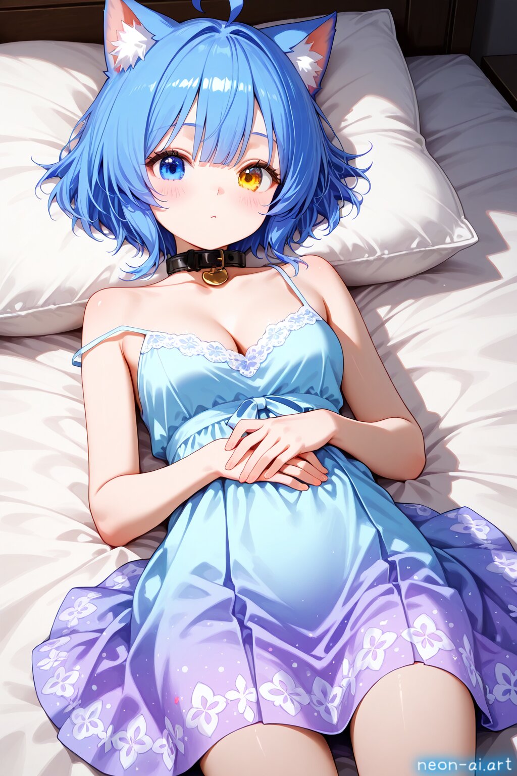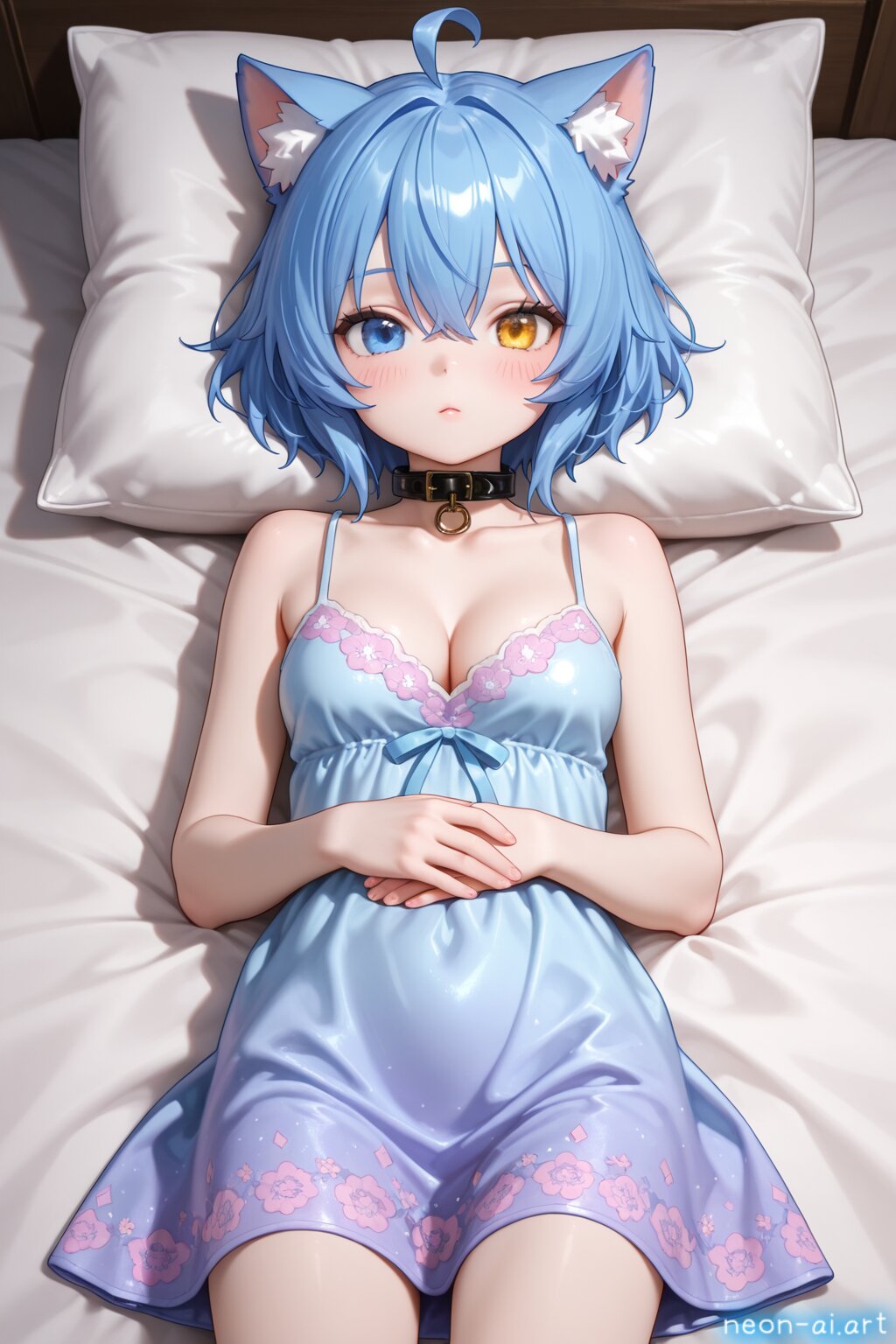 Marbled Satin Slip Dress, This sleek satin slip dress features a swirling marbling pattern in soft pastel hues like lavender, pale blue, and blush pink, The silky material enhances the fluid movement of the marbled design, giving the outfit a dreamy, ethereal look, The dress has thin spaghetti straps, a cowl neckline, and a slightly asymmetrical hemline that falls just above the knee, The marbled pattern gives it a modern, artistic feel while the satin fabric brings in an element of sensuality, Pair it with minimalist jewelry for a chic, seductive evening look, BREAK realistic, lying on back, indoor, bedroom, arms on stomach,