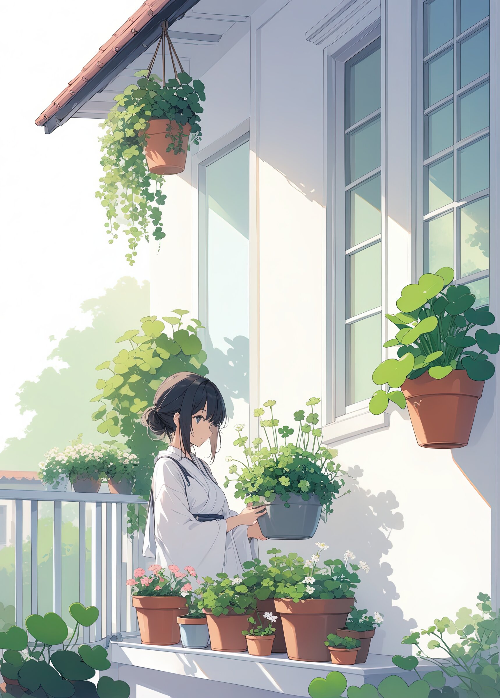 A light novel cover, a white background with a minimalist design, lots of negative space, a vertical title layout on the right side, inspired by Japanese-style vertical text, bright atmosphere, delicate anime-style illustration., A pot with four-leaf clovers is placed on the balcony, mixed in with pots of other plants and flowers., 1girl, standing against the wall
