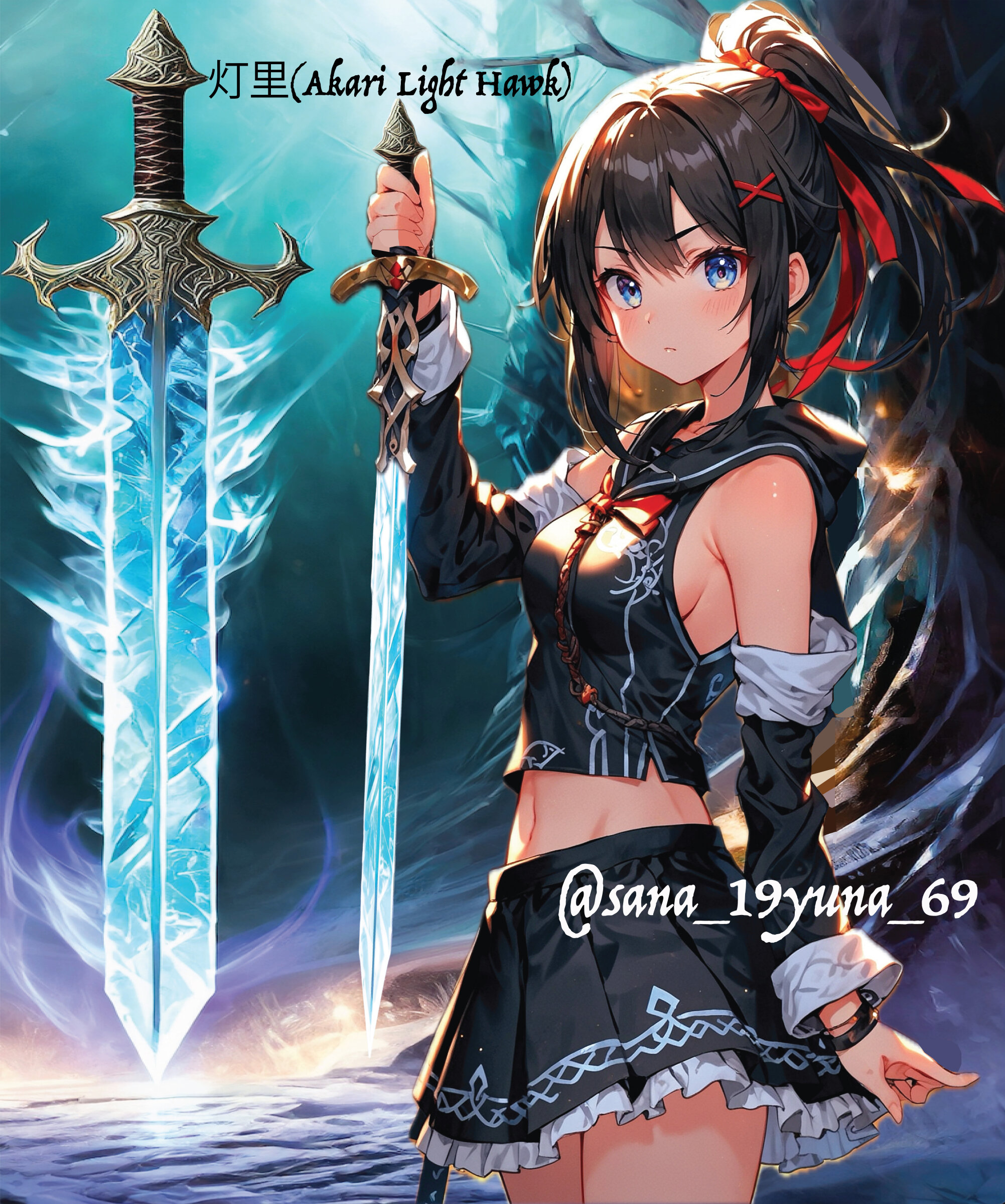 作品は、灯里(Akari Light Hawk)が独自の紋様柄が入ったセーラー服を着て独自の紋様が入った剣を持つ様子❤️