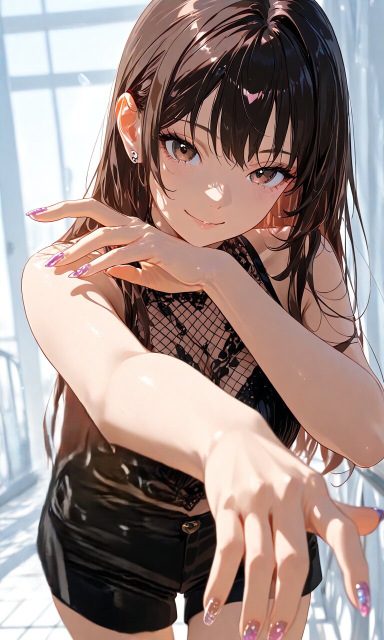 1 lady,smile, cowboy shot, ((nail art)), ,nail art, fingernails,