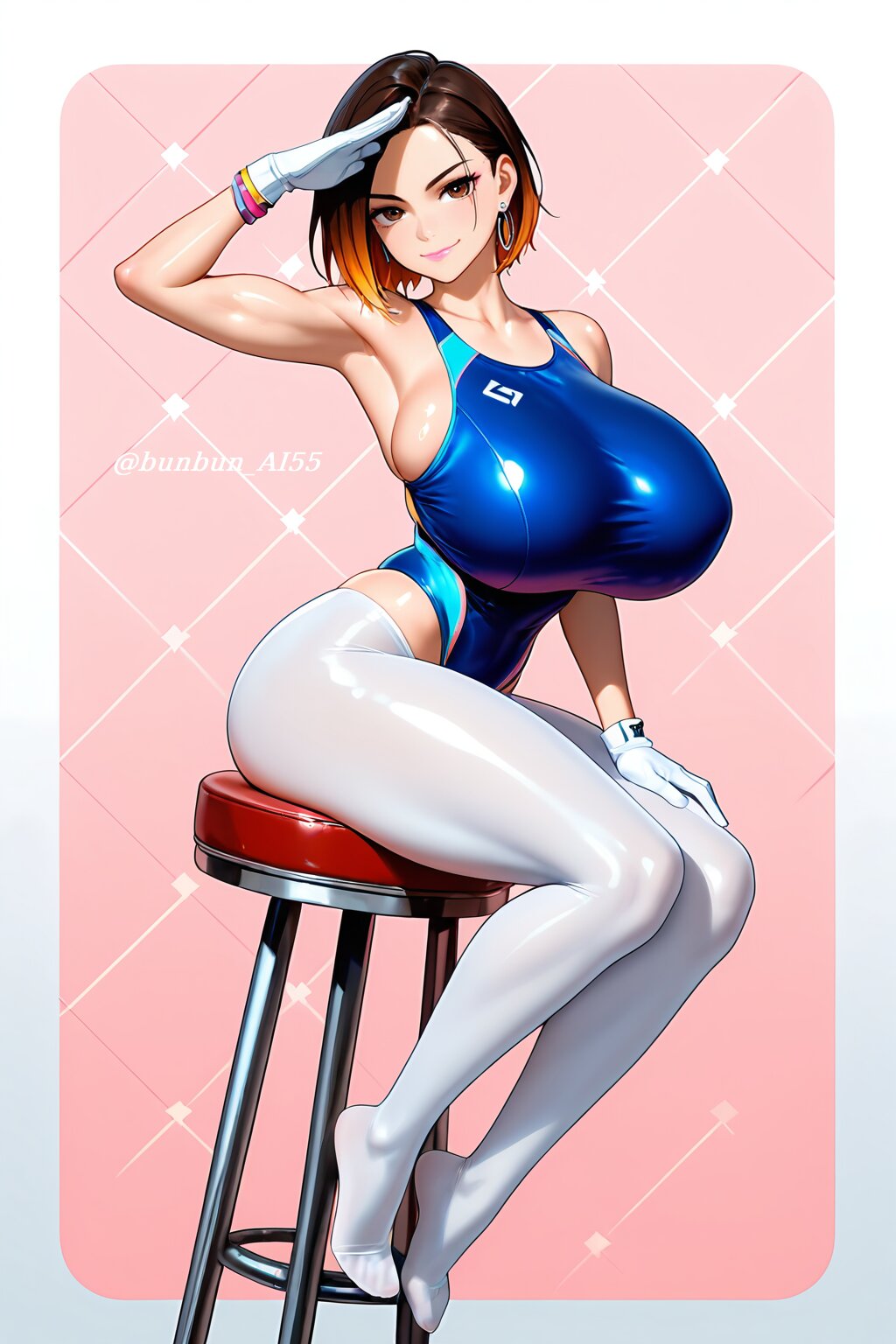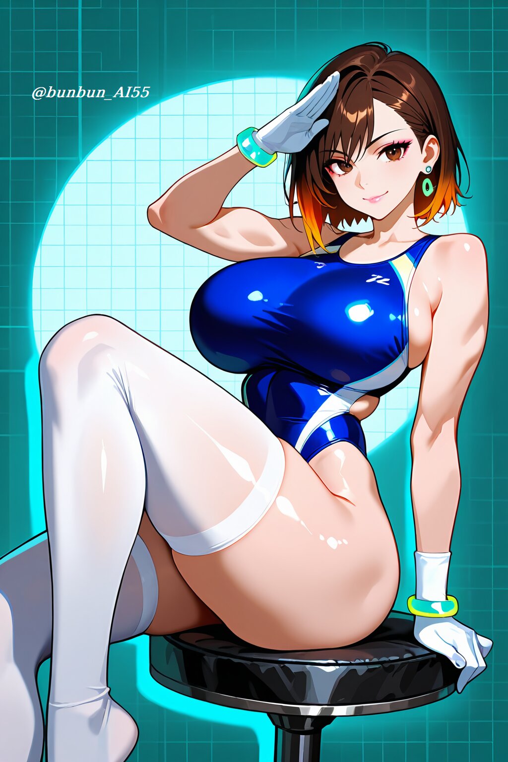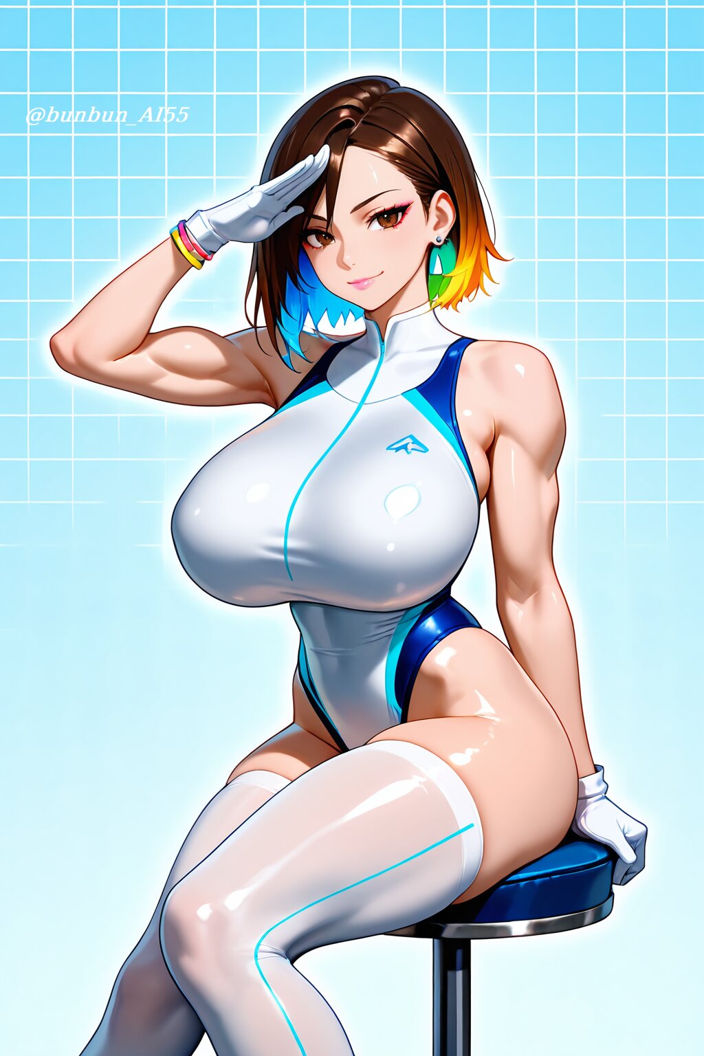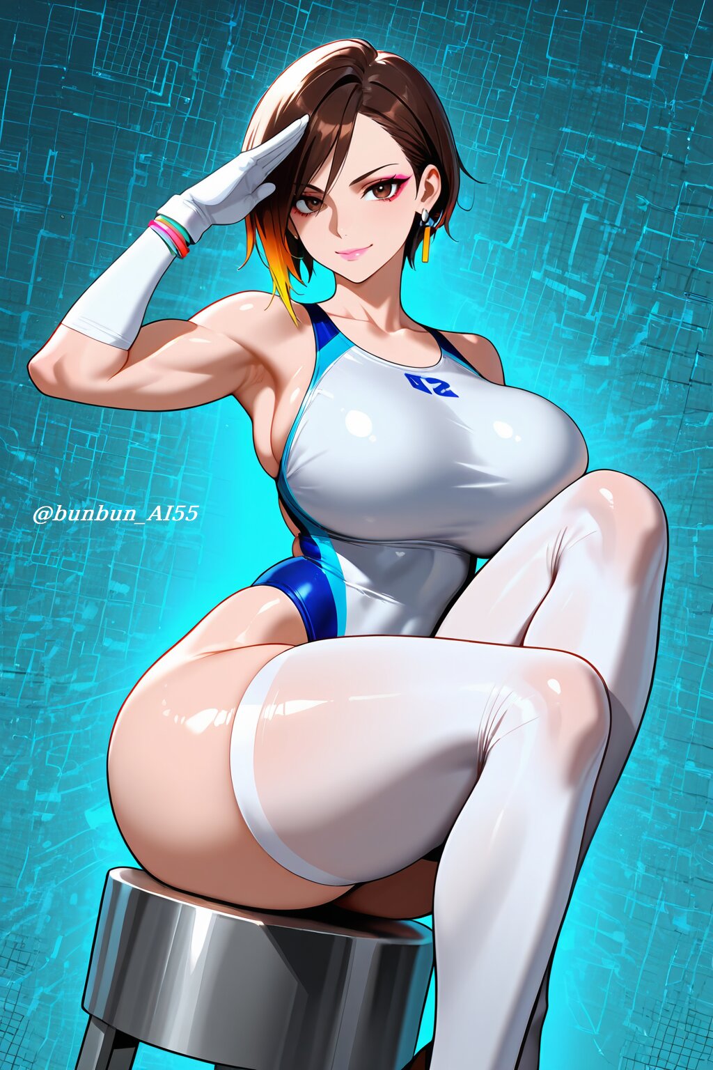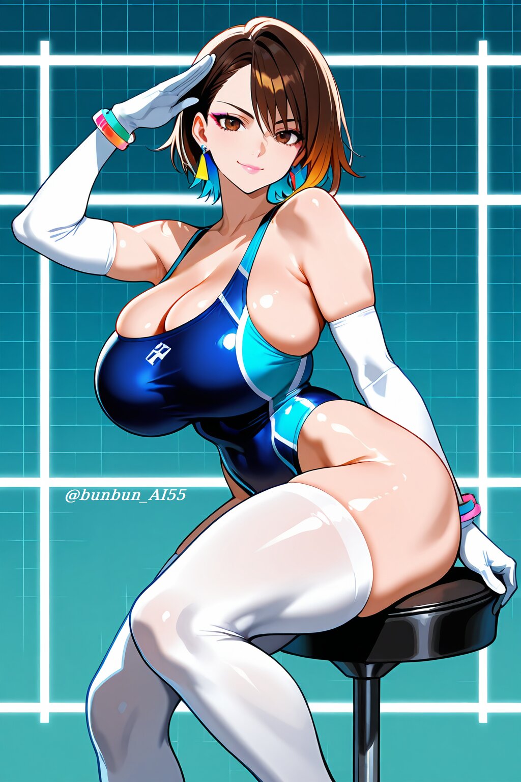 masterpiece, best quality, amazing quality, very aesthetic, absurdres, high resolution, detailed face, expressive eyes, clean lines, vibrant colors, stylized, soft shading, dynamic shading, bright lighting, sharp features, cute, energetic expression, full body, dynamic pose, backlighting, depth of field, anime-inspired, character design, expressive anatomy, smooth gradients, colorful highlights, vibrant, clear lines, BREAK perfect lighting, professional lighting, face lighting, (1girl, elegant beautiful woman:1.5, 21year old), (serious, sexy, model, cool beauty), (beautiful face, slim face, small face, cute face, detailed face, brown eyes, cyberpunk makeup, pink lips), (looking at viewer, alluring gaze, seductive smile), BREAK nsfw, (short brown hair), (jewelry, piercing, earrings, bracelet), (huge breasts, pointy breasts), (long legs, thick thighs), (perfect hands), (shiny skin, glossy skin), (super model body:1.2, muscle body:1.2, slim body, athletic body:1.2), BREAK (wearing a sleek blue highleg competitive swimsuit with white lines:1.5, design:1.2, intricate design:1.2), (white long enamel gloves and white over-the-knee tights), (light reflections), (shiny, glossy, luster), (tight fit), BREAK (sitting on a tall metal stool, salute, dynamic pose), (geometric digital patterns background, digital grid), (face focus shot:1.3, medium shot:1.2, dynamic angle),
