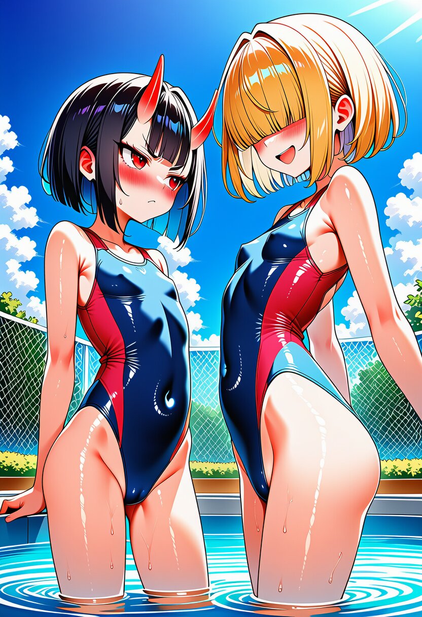 ai-generated, year 2024, anime style, 2girl, yuri, sexy posing, midday, outdoor, in pool, dynamic angle, masterpiece, best quality, ultra detailed, perfect fingers, high resolution, absurdres, perfect anotomy, detailed background, unity 8k wallpaper, -2.5::looking at viewer::, very aesthetic, masterpiece, no text