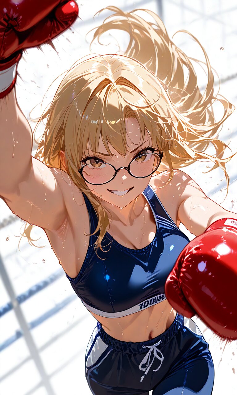 1 lady, long hair, blonde hair, glasses, ,woman in throwing a punch,1girl,boxing gloves, punching,sweat,solo,armpits,close-up punching punch,throwing punch,breasts,pants,looking at viewer,blush,clenching teeth.grin