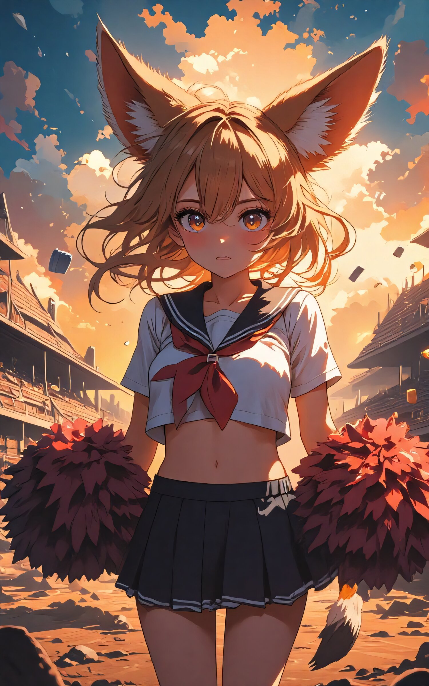 anime style, fox girl, light brown hair, fluffy fox ears, long eyelashes, double eyelids, fluffy tail, sharp fangs, aggressive cheerleader, sailor uniform, red neckerchief, apocalyptic setting, ruined stadium, broken bleachers, burning sky, dramatic lighting, rebellious energy, fierce expression, torn pom-poms, dynamic pose, wind-blown hair, gritty atmosphere, chaotic beauty