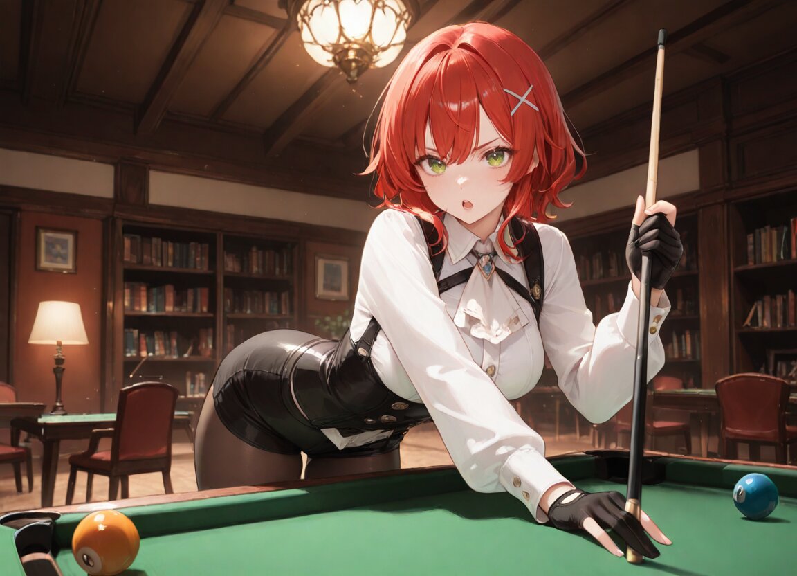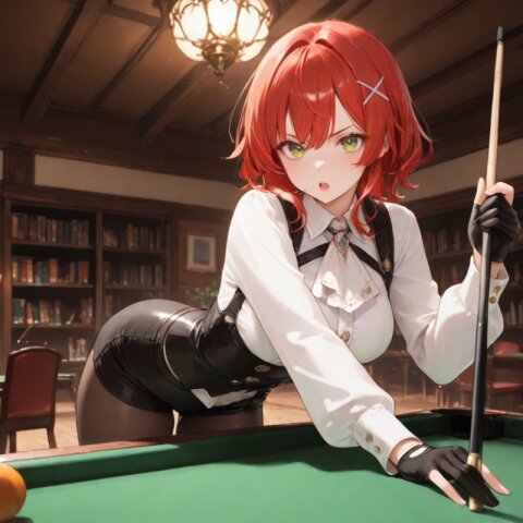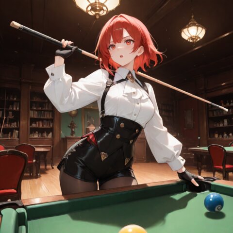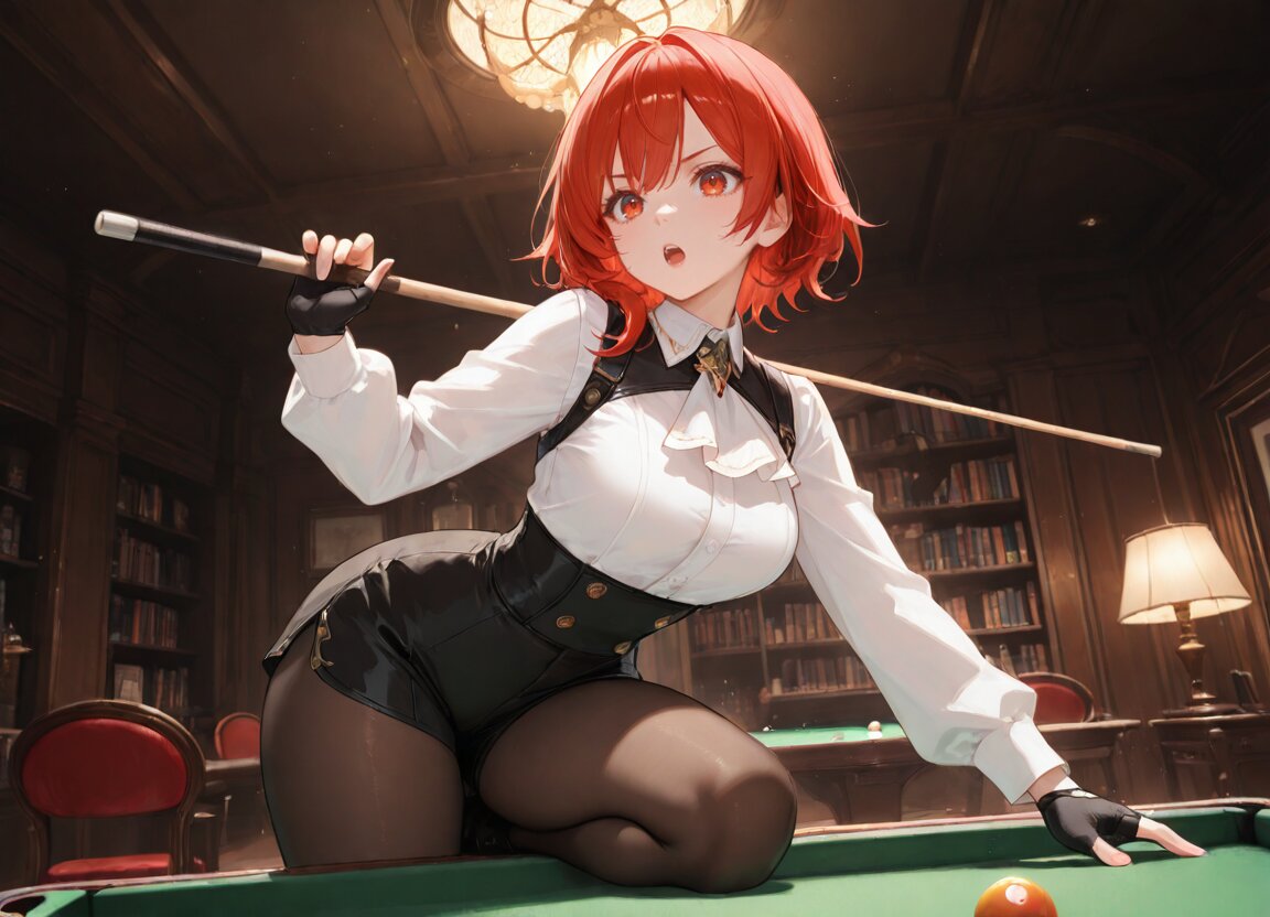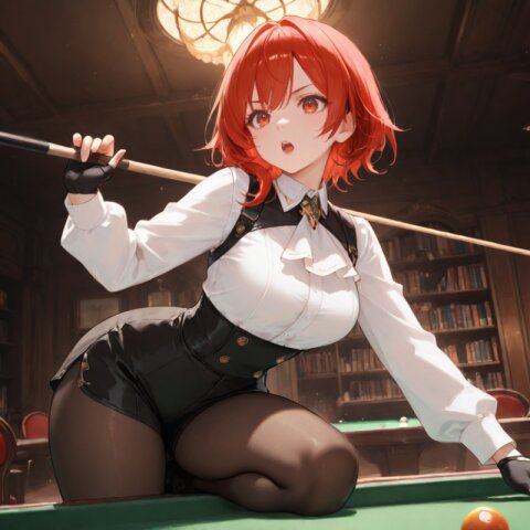 bookshelf,book,chair, pool table,ball,billiard ball,billiards,ceiling, 1girl,solo,:o,holding,holding cue stick,serious,teeth, white ascot,white shirt,long sleeves,black gloves,black shorts,fingerless gloves,partially fingerless gloves,pantyhose,shorts,skirt, cue stick,desk,desk lamp,indoors,lamp,, appropriate posture,appropriate configuration,ideal ratio body proportions,perfect anatomy, <lora:Fixhands_anime_bdsqlsz_V1:1>, masterpiece,best quality,newest,absurdres,highres,ultra high res,8K UHD,hyper-detailed,