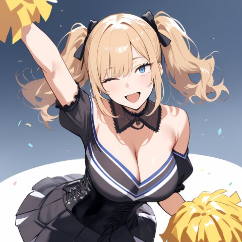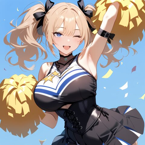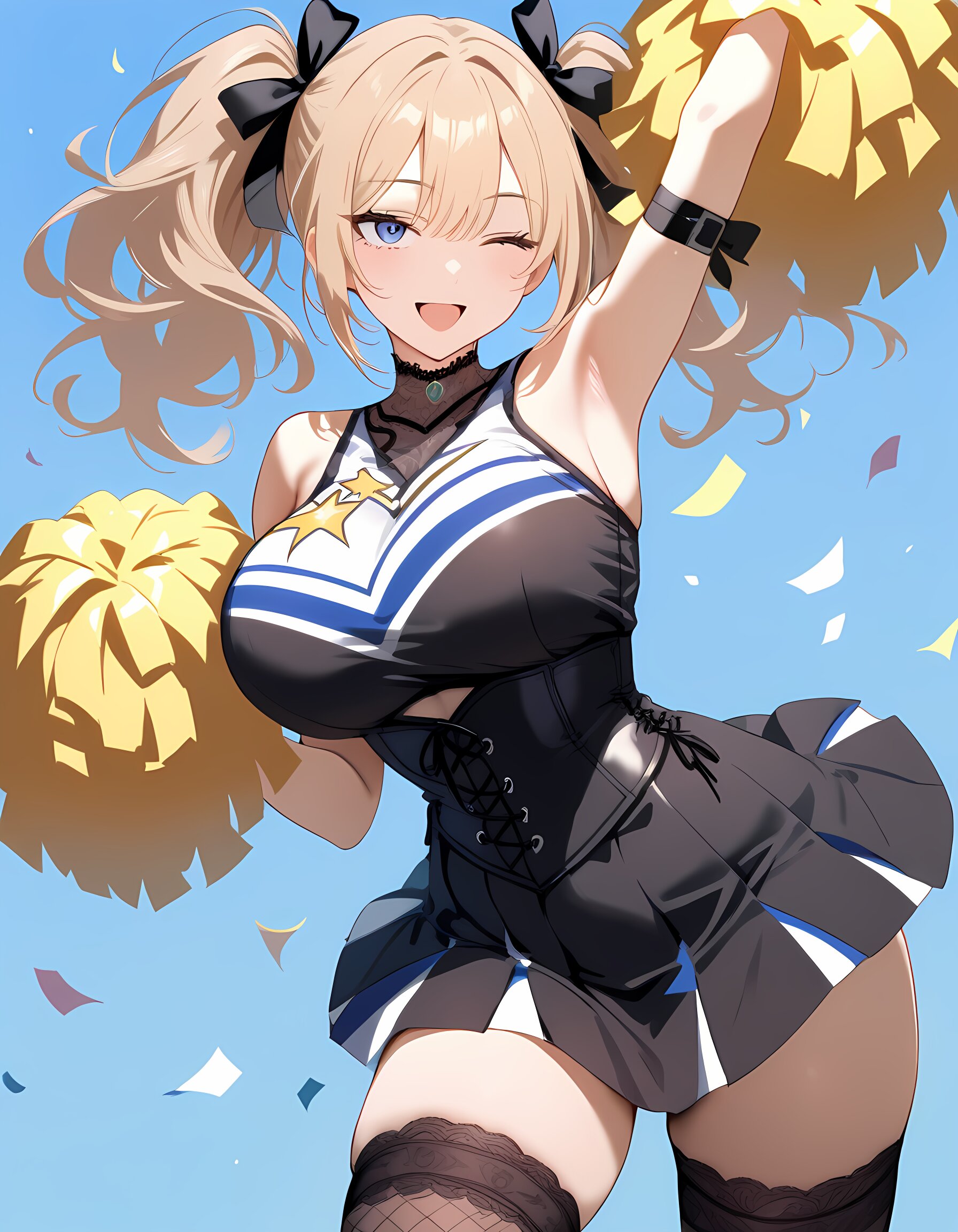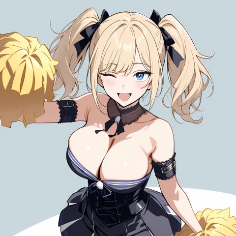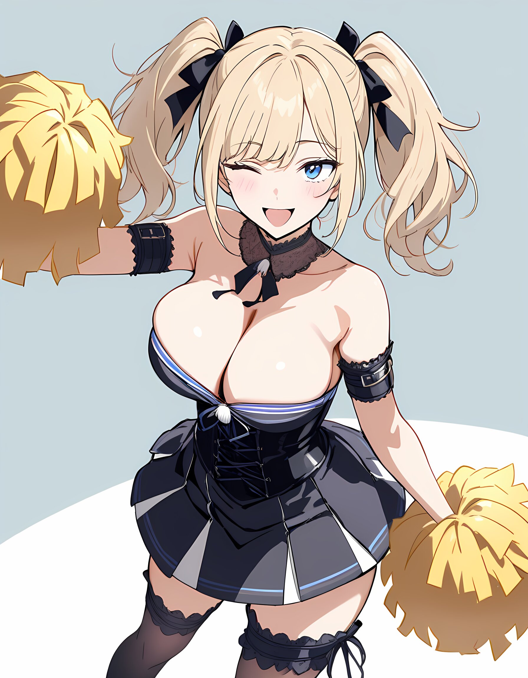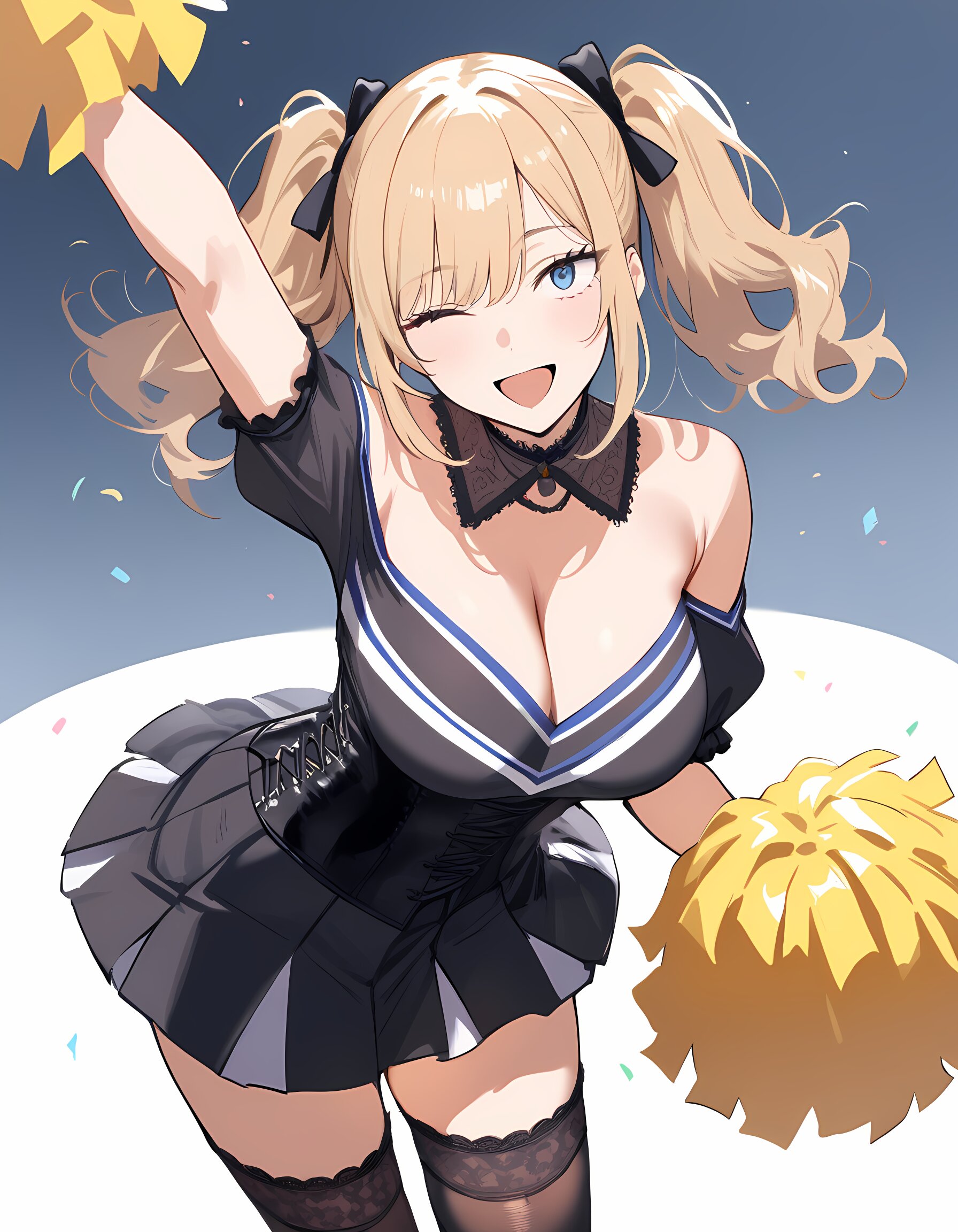 1girl, solo, mature female, blonde hair, medium hair, (long hair:0.2), messy hair, twintails, black ribbon, blue eyes, tsurime, sanpaku, smile, open mouth, one eye closed, arm up, (pom pom \(cheerleader\):1.4) BREAK gothic fashion, black dress, off shoulder, bare shoulder, (off-shoulder dress:1.2), corset, black leather corset, puffy short sleeves, arm strap, arm belt, black gloves, detached collar, lace collar, underbust, large breasts, miniskirt, zettai ryouiki, lace thighhighs, black thighhighs, frilled thigh strap, standing BREAK masterpiece, great score, high score, absurdres