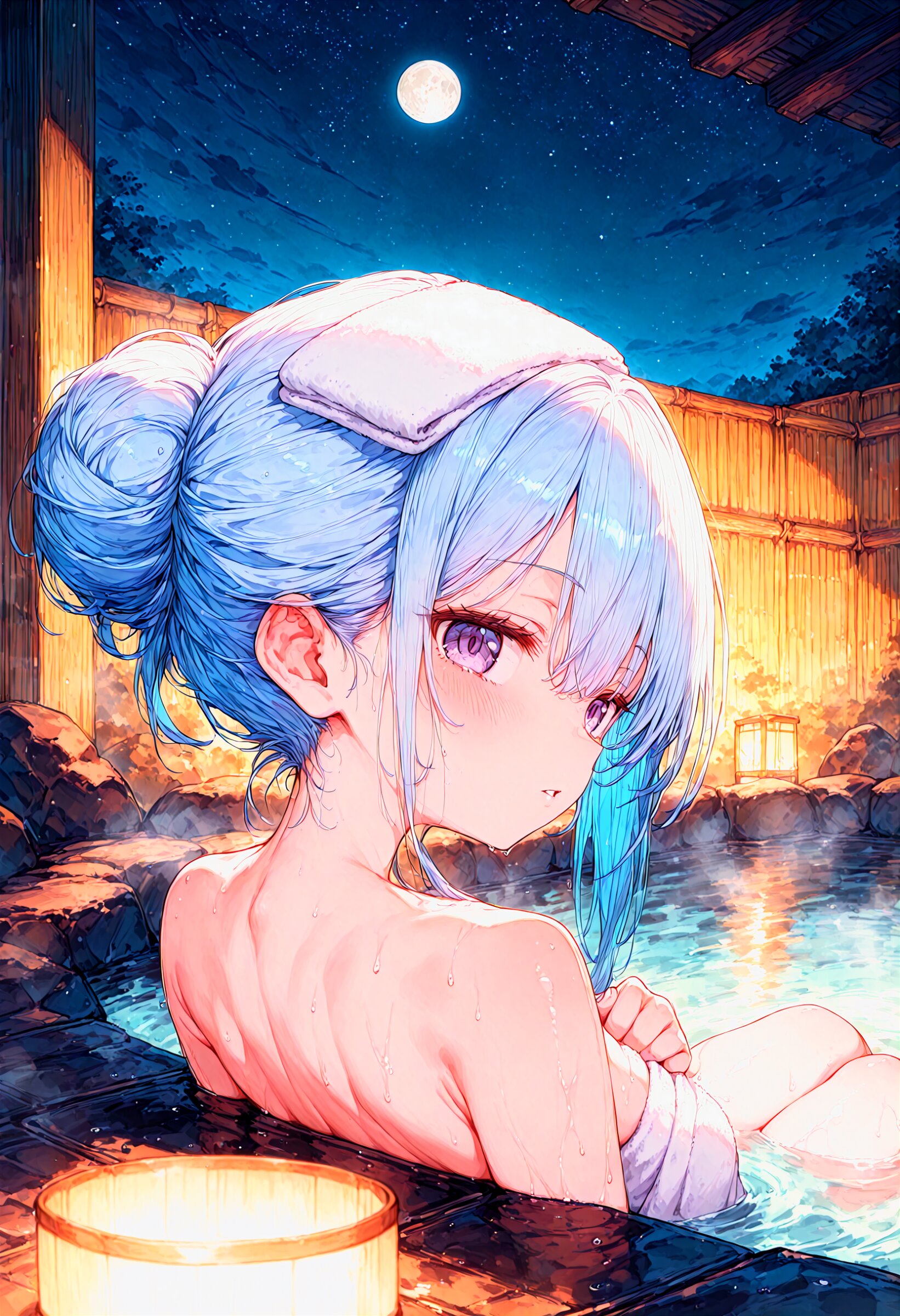 beautiful detailed background, best quality, (pale color:0.5), dark theme, blush, 1girl,solo, parted lips,(Expressionless:0.8), big eyes,half-closed eyes, tareme,pale purple eyes, bathing,open-air bath, moon, night, night sky, sky,starry sky, onsen,spa, outdoors, partially submerged, (towel:1.2), towel on head, water,(wet:0.8), (silver hair:1.1), (dark blue hair colored inner hair:0.8), long hair,bun hair, eyebrows visible through hair, mini hat, (upper back:1.1),Lean on, looking at viewer, (looking back,:1.1) <lora:sdxl2-flat2-512b:-1.8> <lora:noline-16oa:-1.1> <lora:clarity:2.25> <lora:sdxl-shadow_01:-1.0>