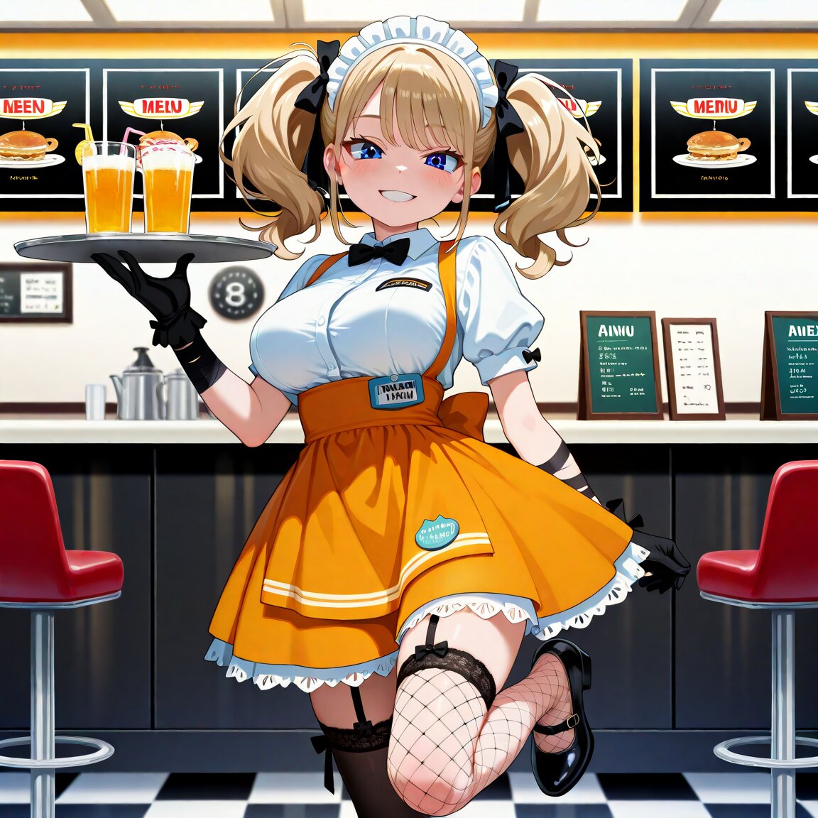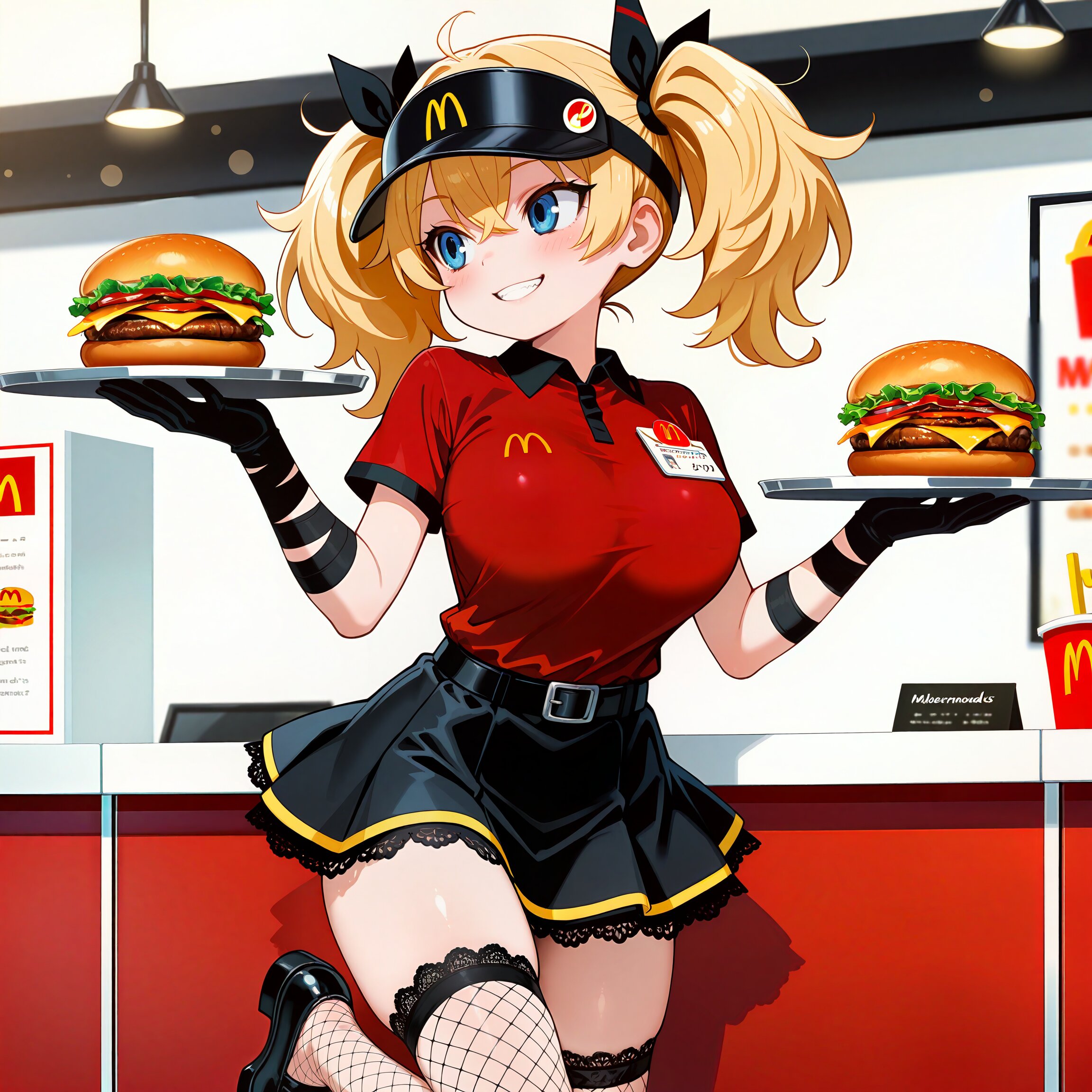 best quality, amazing quality, very aesthetic, absurdres, newest, high quality, ultra detailed, highly detailed, high detail, hyperrealism, high resolution, intricate details, bokeh, inside McDonald's restaurant, holding a tray, holding a burger, brightly lit fast food restaurant, menu board in background, BREAK //Character (loli:1.2), skinny, (skinny limbs:1.1), long hair, twintails, (messy hair:1.1), blonde hair, bangs, blue eyes, sharp eyes, medium hair, 0.2::long hair::, black ribbon, tsurime, large breasts, smile, a young female McDonald's crew member, wearing a clean red polo shirt with a small logo, black miniskirt, a black visor with McDonald's logo, a name tag, smiling, friendly expression, standing behind the counter inside a brightly lit McDonald's restaurant, lace decoration on skirt hem, black belt around arm, black bandage wrapped around arms, black gloves, bare thighs, asymmetrical design thigh-high stockings with ribbon decoration, different designs on each leg, fishnet thigh-high stockings on one leg, opaque black thigh-high stockings on one leg, BREAK dynamic pose, motion blur, (upper body:1.5), looking to the side, BREAK <lora:ZankuroStyleIllustrious_v2:0.5>,