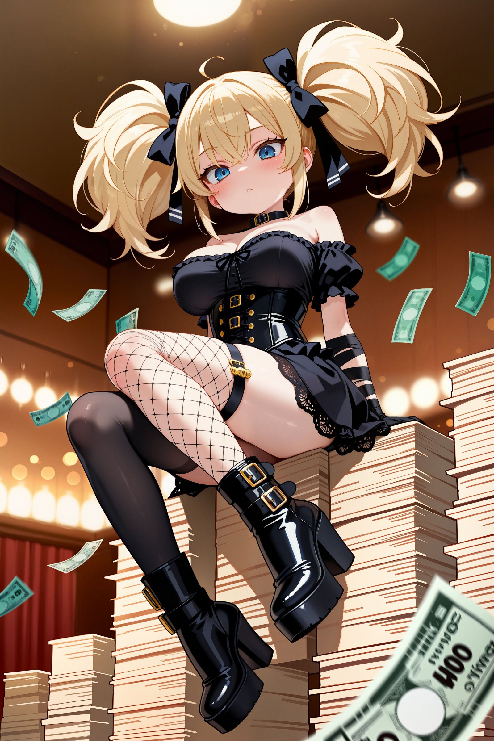 best quality, amazing quality, very aesthetic, absurdres, newest, high quality, ultra detailed, highly detailed, high detail, hyperrealism, high resolution, intricate details, bokeh, US dollar bills, stacks of dollar bills on sitting, dollar bills scattering, cash fluttering, dramatic lighting, rich shadows, symbol of wealth, 4K resolution, BREAK //Character (loli:1.2), skinny, (skinny limbs:1.1), long hair, twintails, (messy hair:1.1), blonde hair, hair blowing in wind, bangs, blue eyes, sharp eyes, medium hair, 0.2::long hair::, big hair, black ribbon, tsurime, large breasts, goth fashion, black dress, off shoulder, bare shoulder, off-shoulder dress, puffy short sleeves, voluminous puff silhouette, black leather waist cincher shaped bodice, underboobs supported from below waist cincher, black eyelet belt attached to bottom of corset, gold buckle, black flared skirt, wide A-line, lace decoration on skirt hem, black belt around arm, black bandage wrapped around arms, black gloves, bare thighs, asymmetrical design thigh-high stockings with ribbon decoration, different designs on each leg, fishnet thigh-high stockings on one leg, opaque black thigh-high stockings on one leg, black platform boots with heels, BREAK sitting, dynamic pose, motion blur, (from below:1.1), BREAK <lora:ZankuroStyleIllustrious_v2:0.5>,