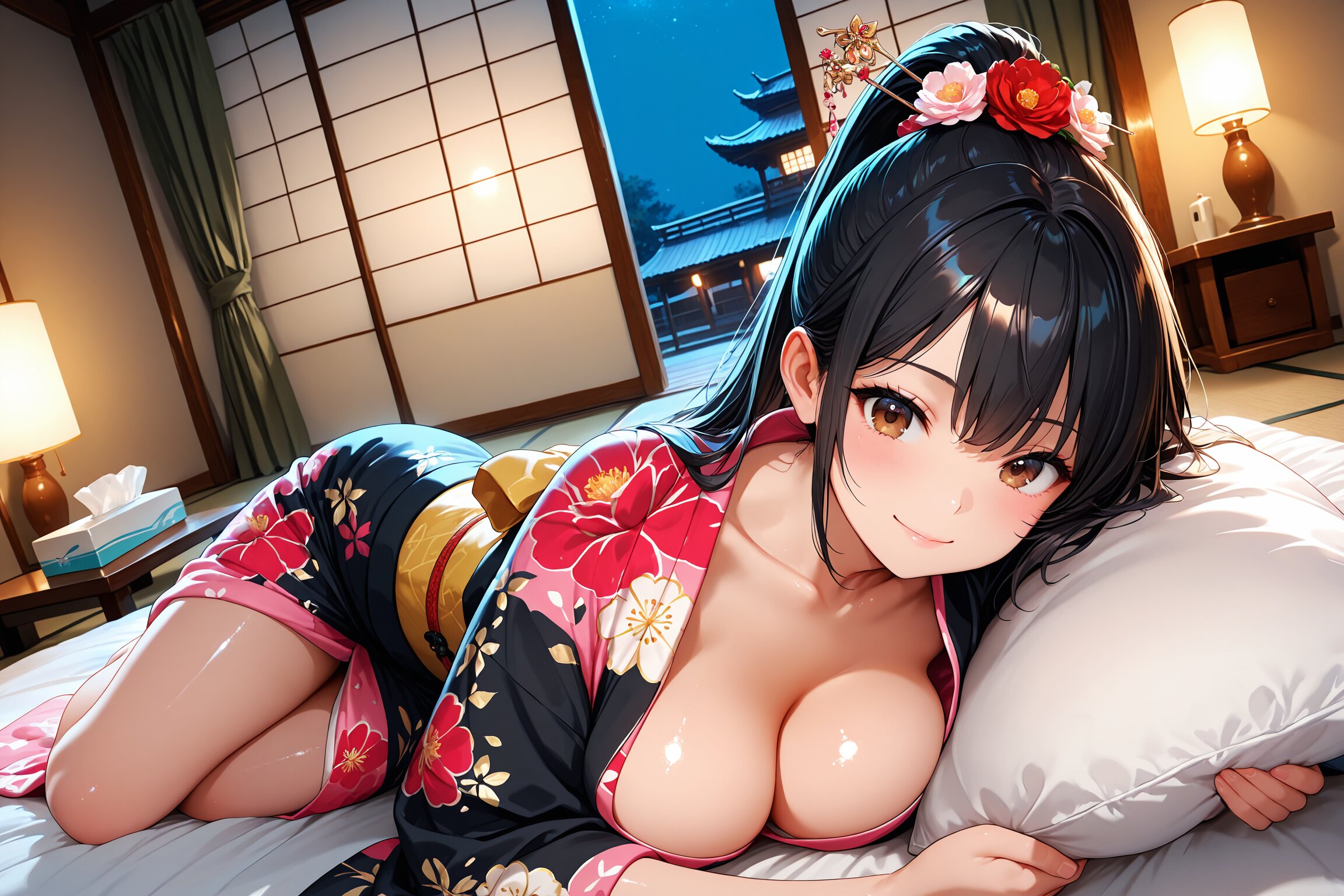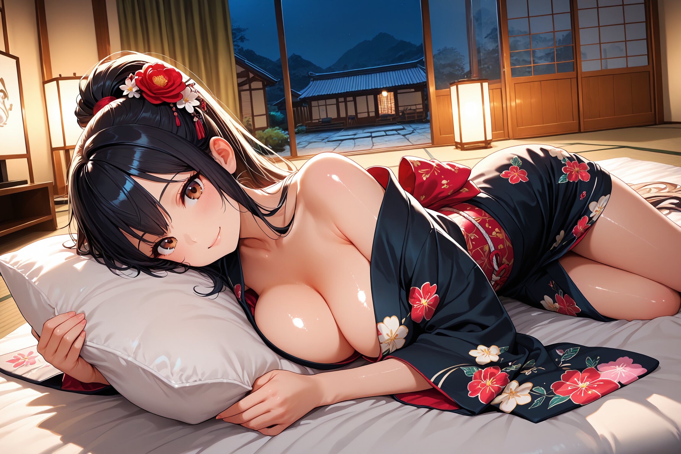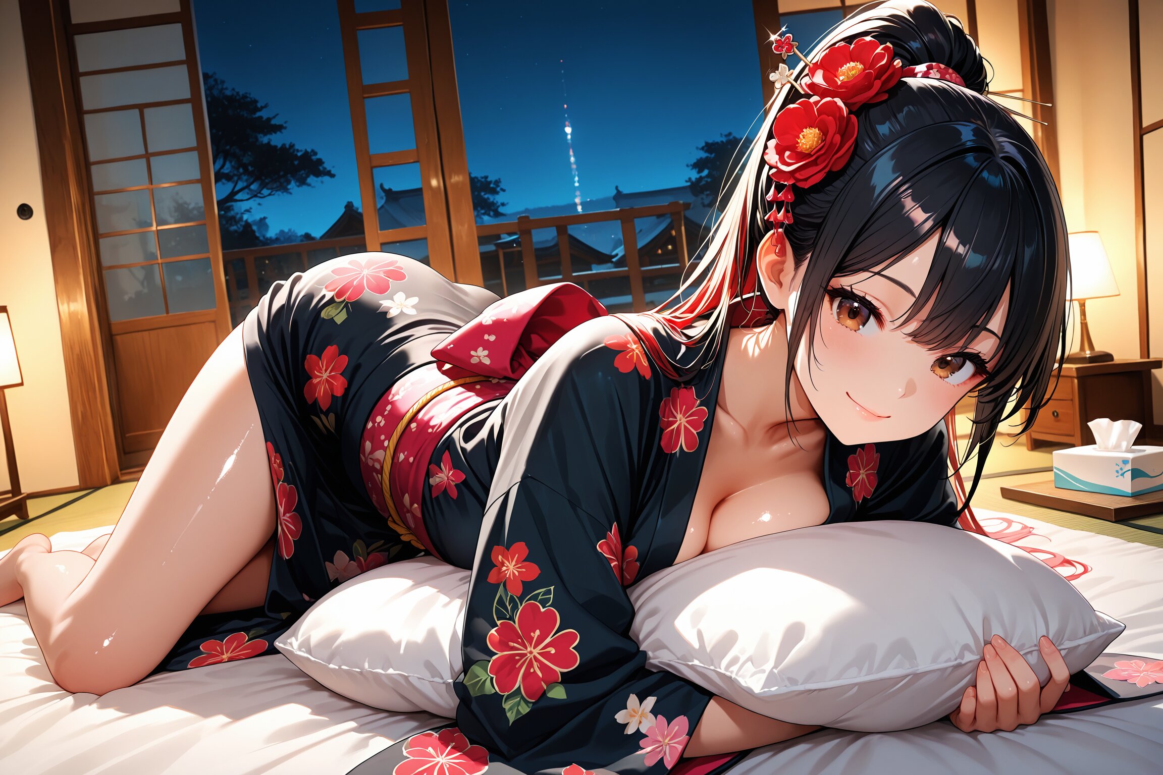 着物のすそを膝元でたたみ、雅は静かに布団へ身を沈める。