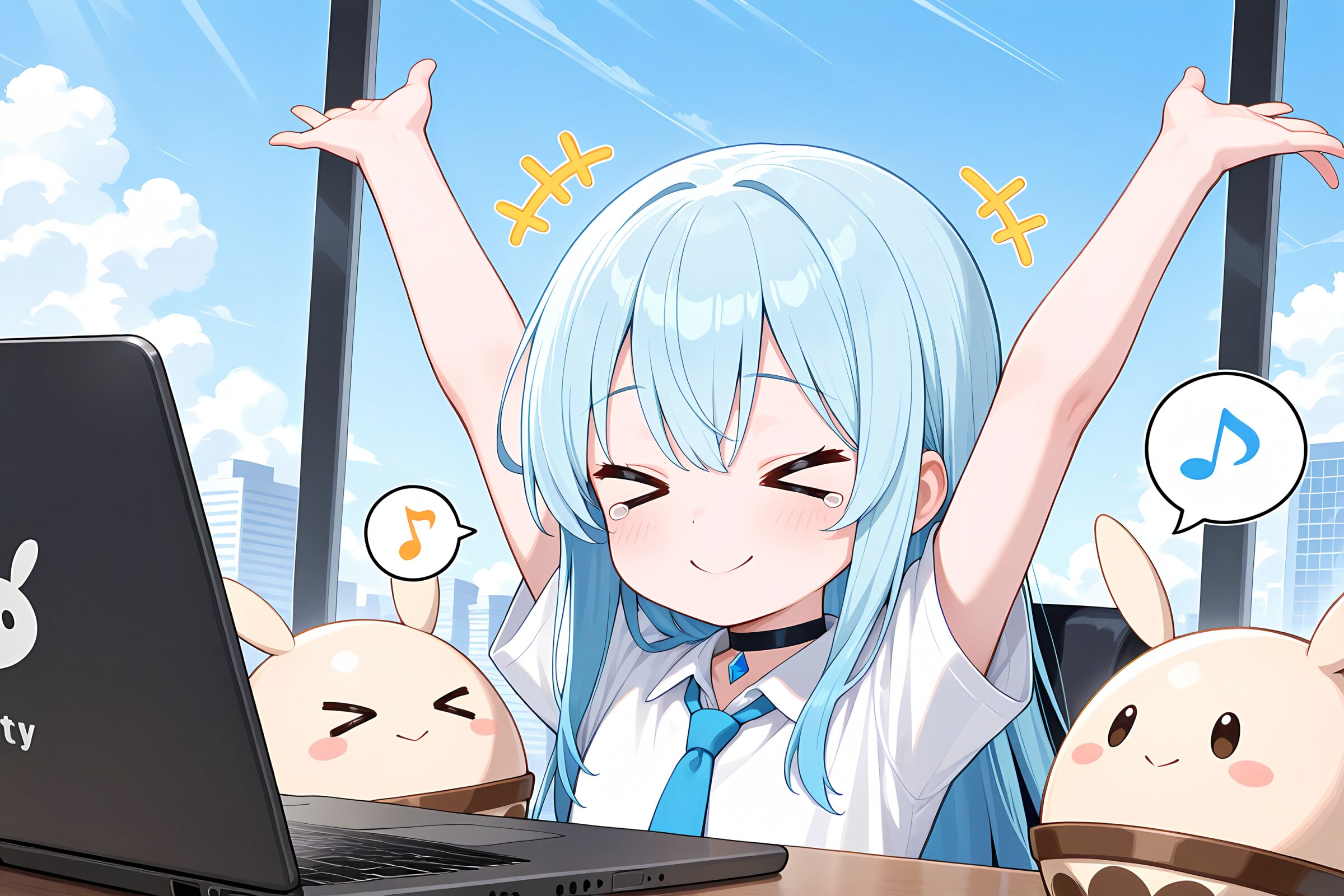 1 little girl, solo, diagonal angle, upper body, masterpiece, best quality, amazing quality, very aesthetic, sky blue hair, long hair, straight hair, > <, closed mouth, tearful, smile, cheerful, +++, notice lines, spoken musical note, choker, white shirt, blue tie, arms up, laptop, humpty dumpty jumping, > <, in office, morning,