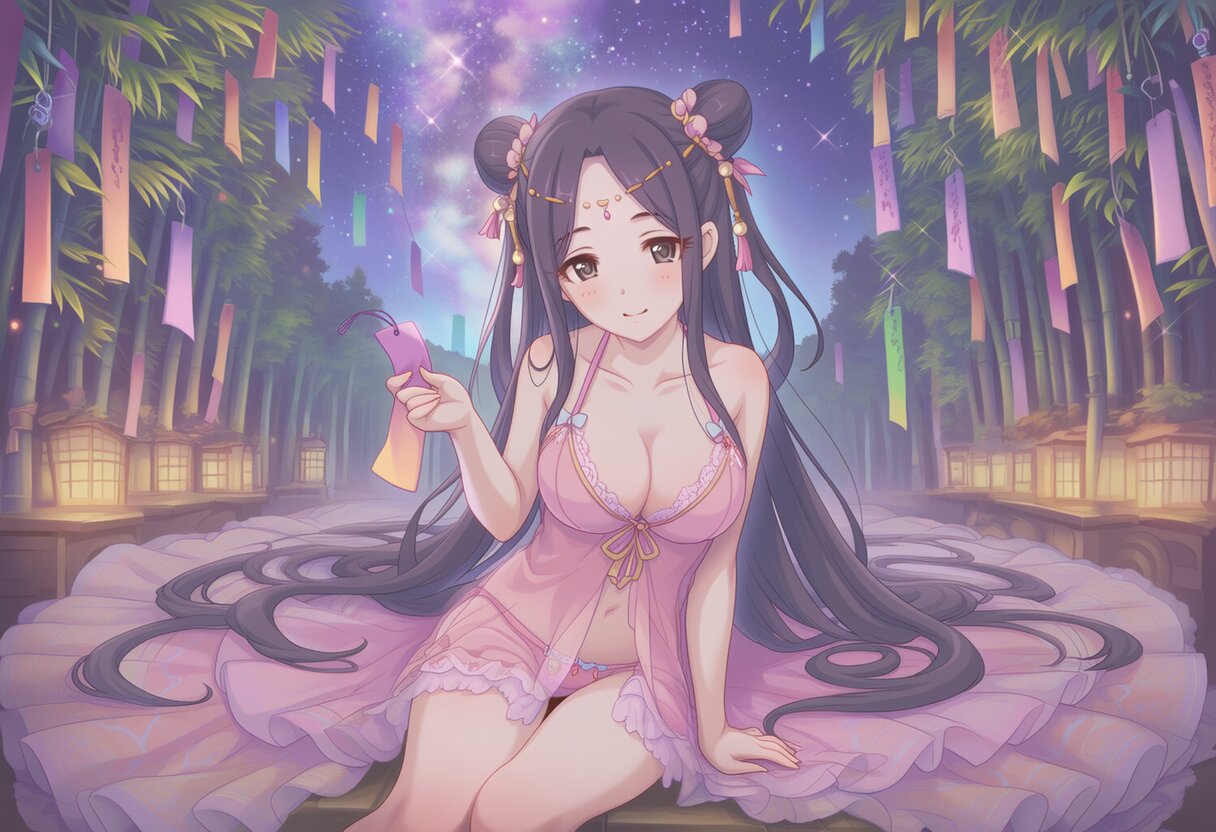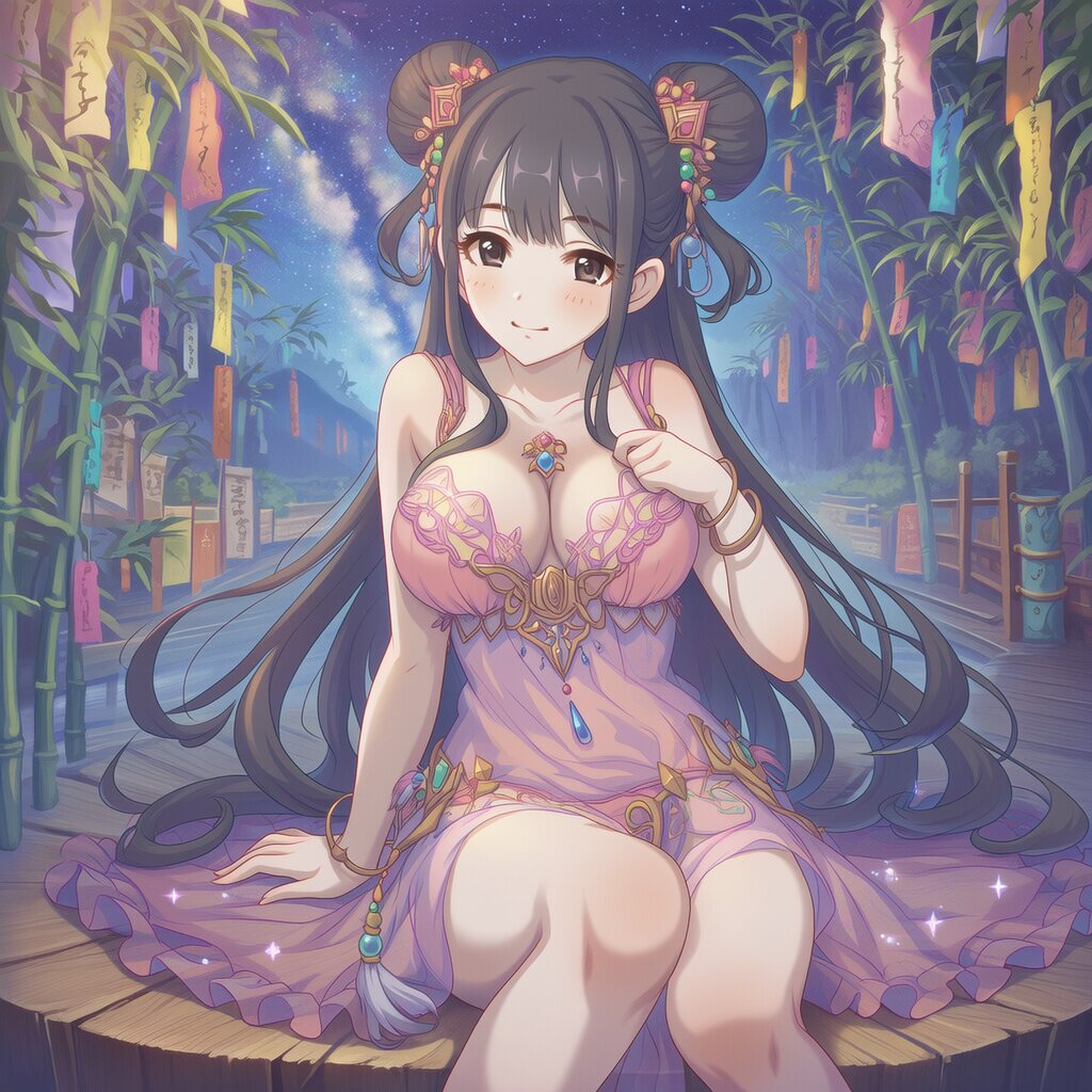 {{{highly detailed}}}, {{official style}}, {{game cg}}, style of ai-generated, {{cygames style, princess connect!}}, {{fairy}}, {{{ancient chinese costumes}}}, 1girl, solo, black hair, very long heir, {{hair bun, two side up}}, {{{straight hair}}}, forehead, black eyes, large breasts, light smile, {{{{pink lingerie}}}}, cowboy shot, sitting, night, milky way, {{{{{{bamboo grove, stage, tanabata, colorful ribbons hang from the trees}}}}}}, prayer flags, hanging trees, beautiful image, traditional japanese colors, {{{masterpiece}}}, {{{best quality}}}, {{{very aesthetic}}}, {{{ultra-detailed}}}, {illustration}, {{{extremely detailed}}}, {{{an extremely delicate and beautiful}}}