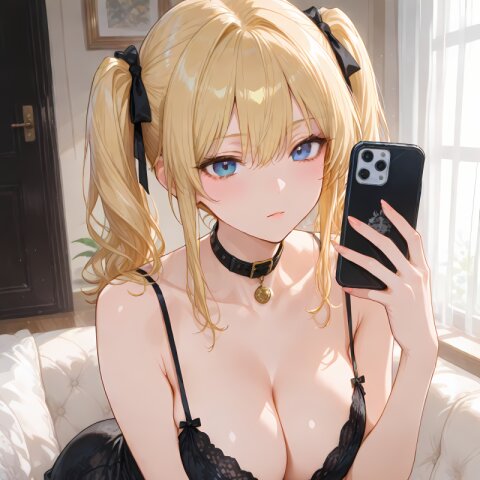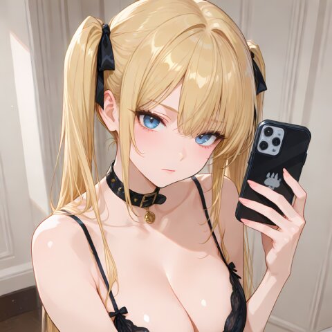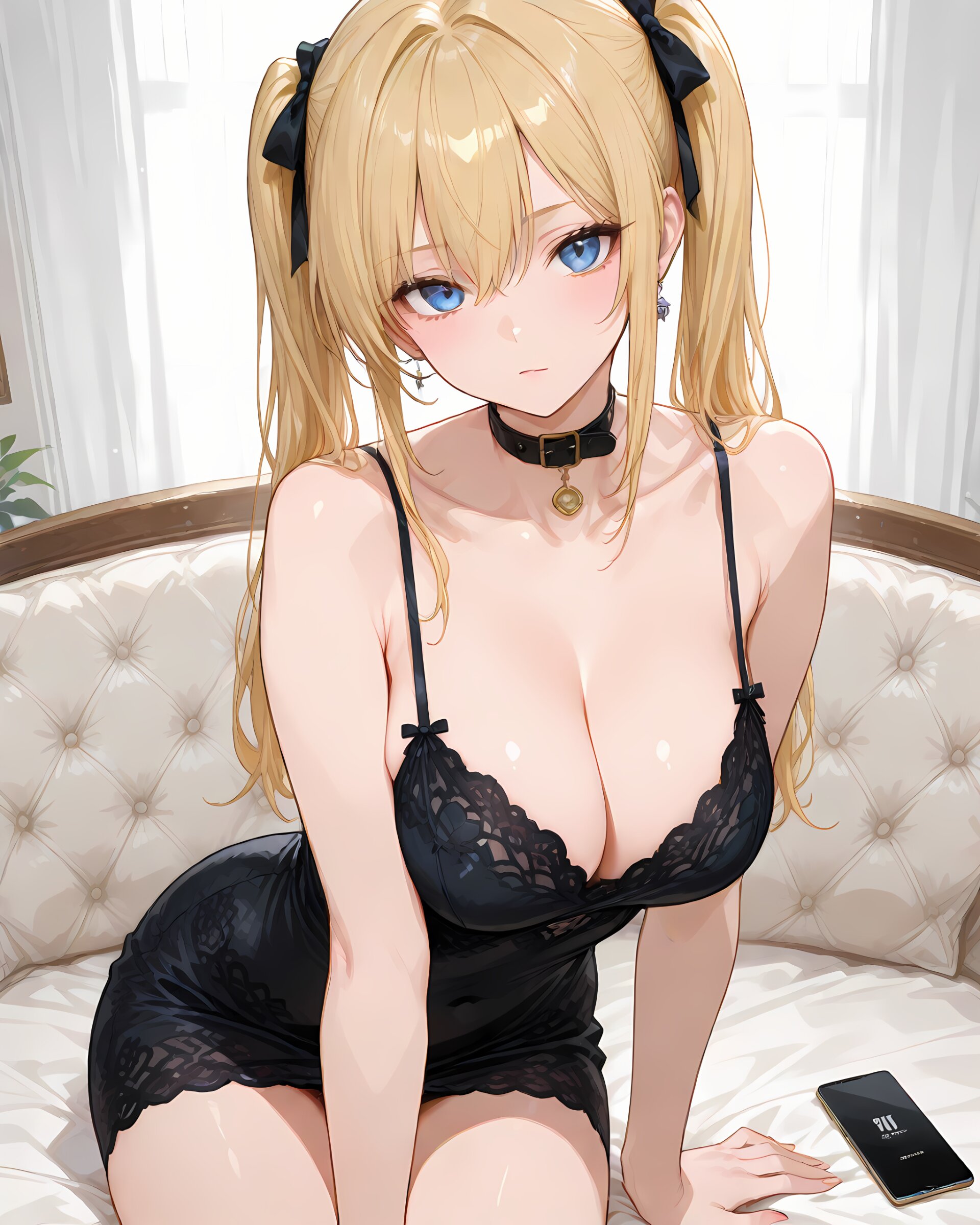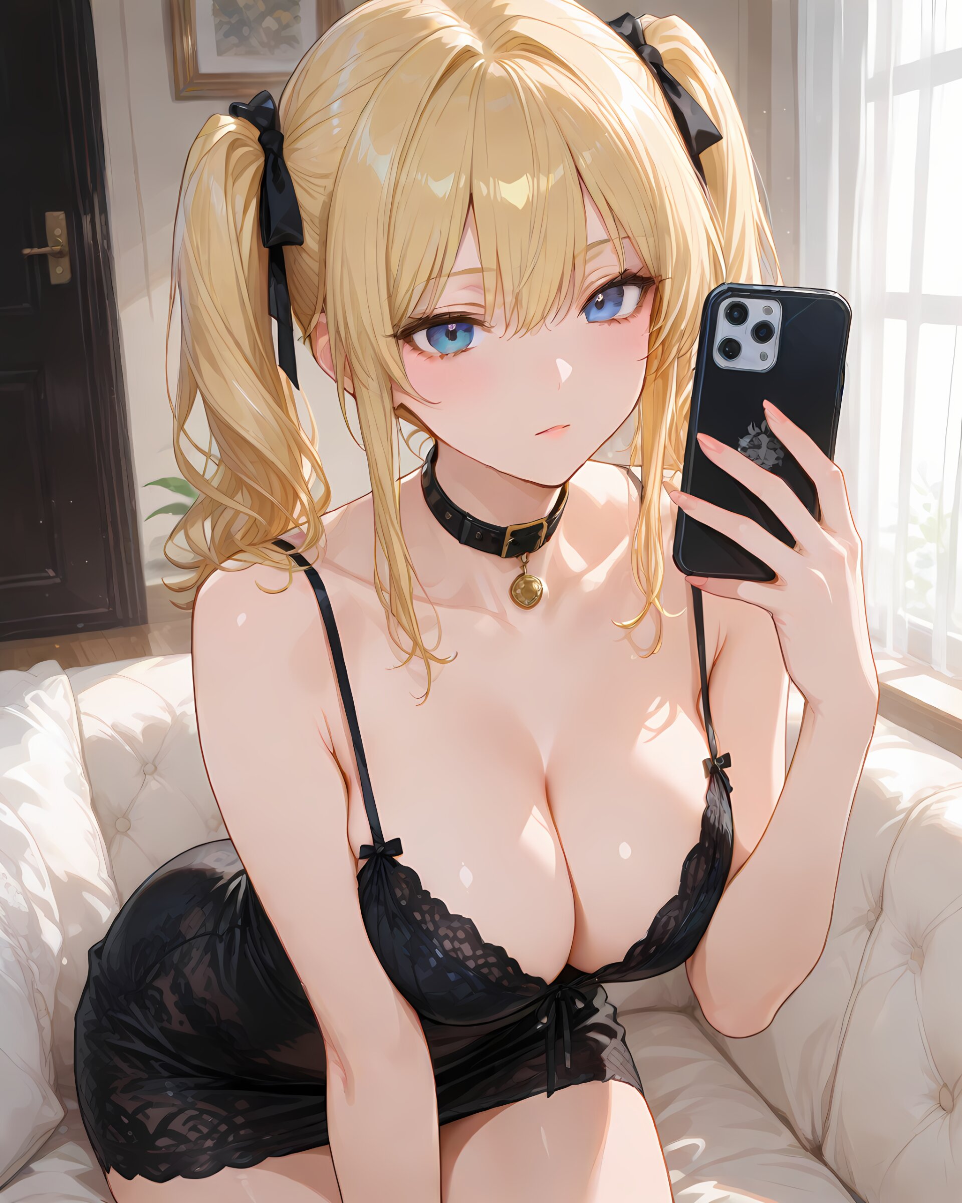 <lora:hyper_sdxl_8_step_lora_f16:1>,, 1girl, twin tails, middle yellow hair, blue eyes, large breasts, cleavage, collar bone, black lace dress, spaghetti strap, elegant pose, smartphone, BREAK masterpiece, amazing quality, best quality, very aesthetic, ultra-detailed,