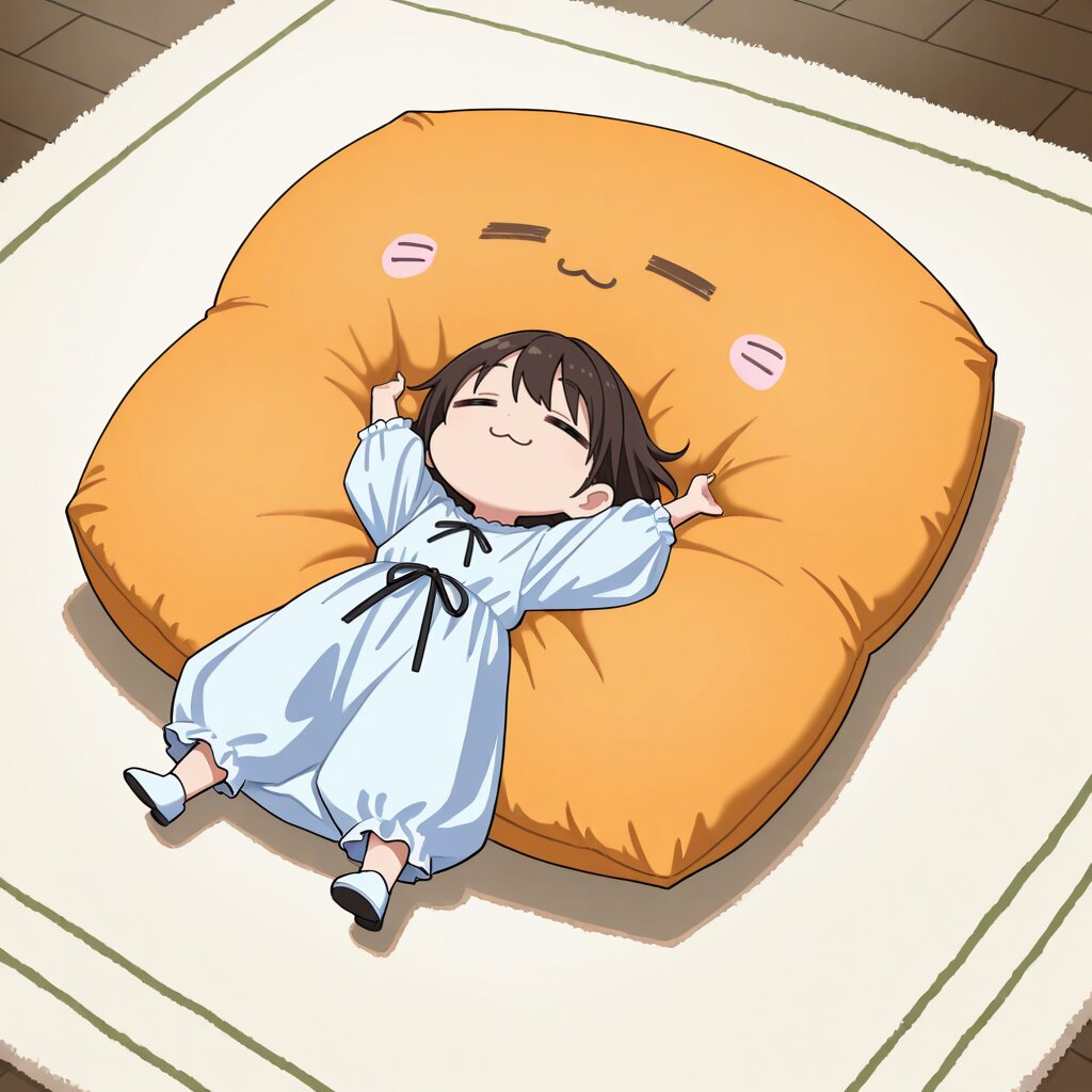 masterpiece,best quality,highres,highly detailed,general,chibi,1girl,solo,(lying in gigantic cushion,Yogibo:1.3),=_=,smile,:3,closed eyes,(long blouse,long pants),on back,from above,