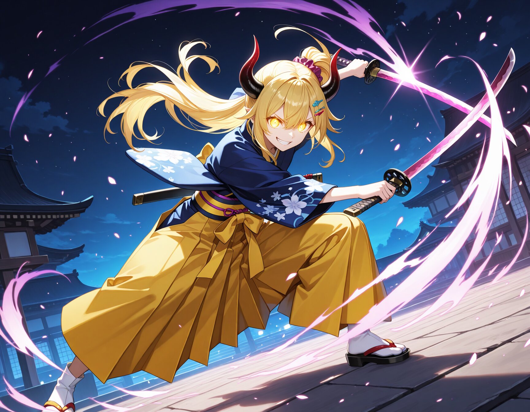 (attack,fighting,action,dark aura,dual wielding, katana,speed lines, motion lines, ),1girl,solo,17yo,two demon horns,blonde hair,long hair,glowing eyes,side ponytail,hair scrunchie,colorful hairclip,smile,angry smile,grin,long sleeves,long glowing golden japanese clothes,obi,long yellow hakama,tabi BREAK night,fantasy,portrait,dutch angle,dynamic pose,general BREAK masterpiece,highres,ultra detailed,best quality,beautiful detailed glow,best illuminate,ultra detailed,extremely detailed CG unity 8k wallpaper,Highly Detailed beautiful and aesthetic,high resolution,detailed,intricate details,hyper detail,sharp detail,detailed,highres,intricate details,amazing quality,very aesthetic,high resolution,ultra-detailed,absurdres,newest,scenery,rendered,depth of field,volumetric lighting,