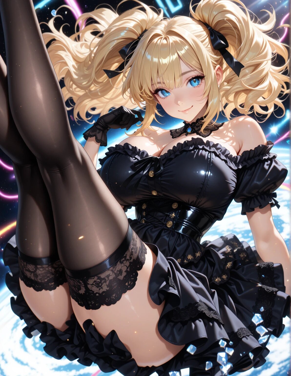 (newest anime style),digital syber space,neon ray,digital script,1girl,solo,dynamic angle,floating in the air,blonde hair,medium hair,messy hairtwintails,big hair,black ribbon,blue eyes,gentle smile,gothic fashion,black dress,off shoulder,bare shoulder,puffy short sleeves,black gloves,detached collar,lace collar,huge breasts,short skirt,black lace thighhighs,legs up,((masterpiece, best quality, extremely detailed, absurdres)),
