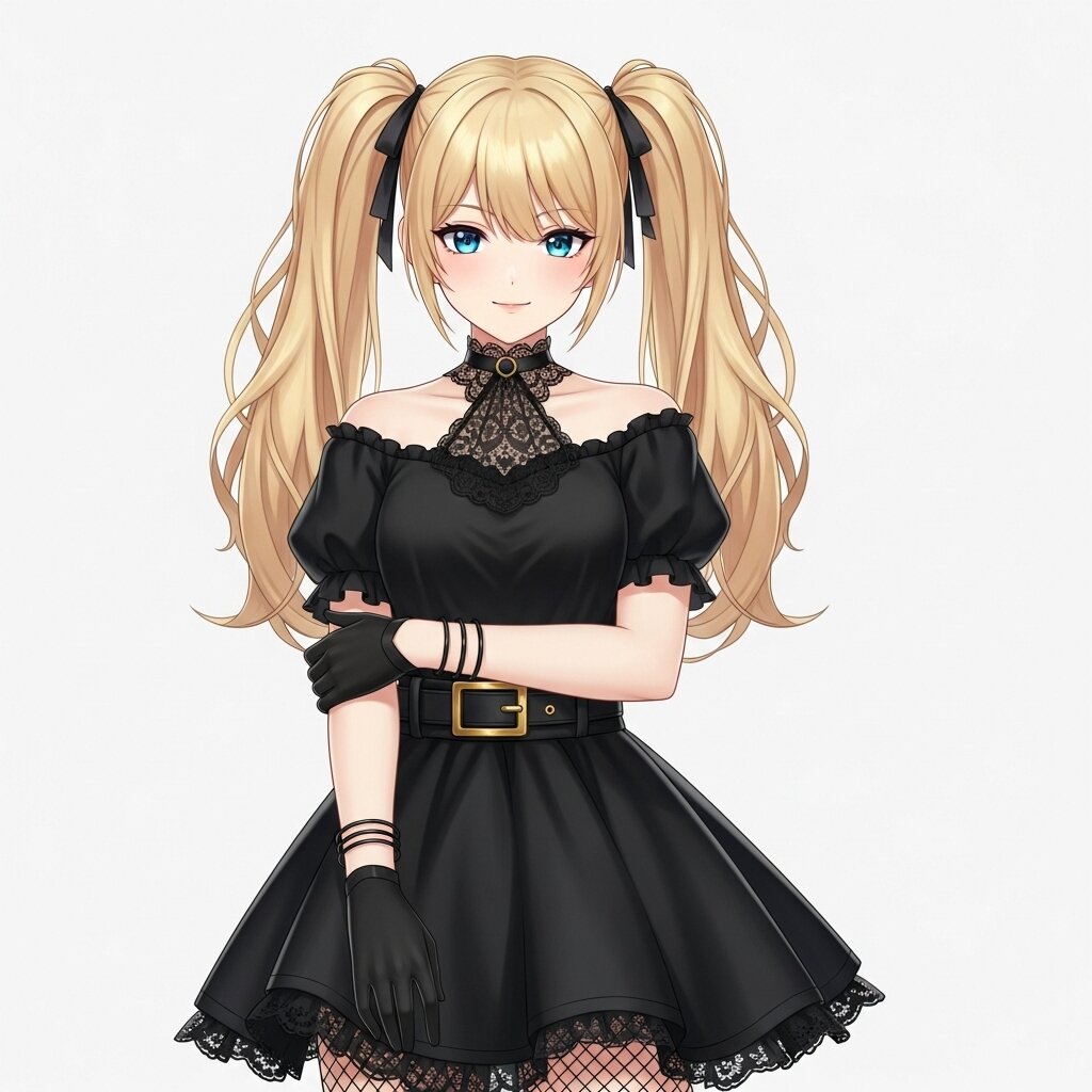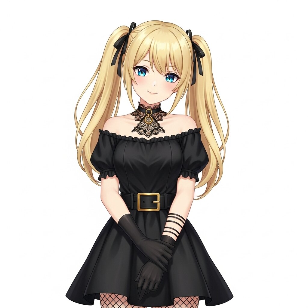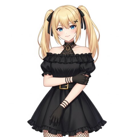 A digital rendering of a young female character with blonde hair tied into two high pigtails, each secured with black hair ties. She has blue eyes, a small nose, and a slight smile. Her skin tone is light. She is wearing a black off-the-shoulder dress with puffed sleeves. The neckline of the dress features a black lace choker attached to the garment. Around her waist, there is a black belt with a rectangular gold buckle that has a horizontal bar in the middle. The skirt of the dress is short and flared. She wears black gloves on both hands, extending up her forearms. On her left arm, above the glove, she has three thin black bangles. Her right hand is placed over her left wrist. She is also wearing black fishnet stockings.