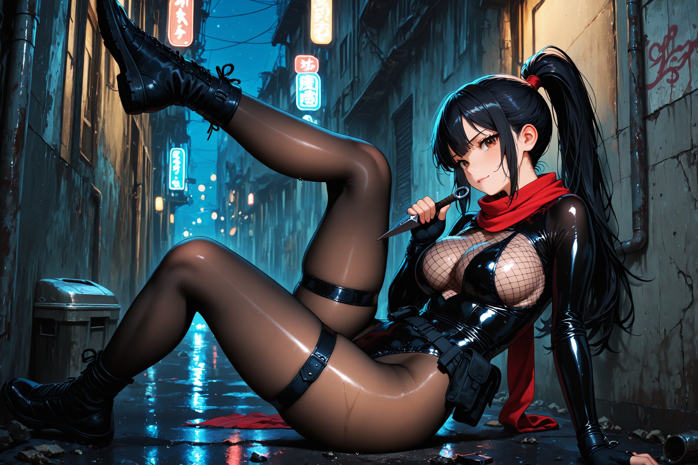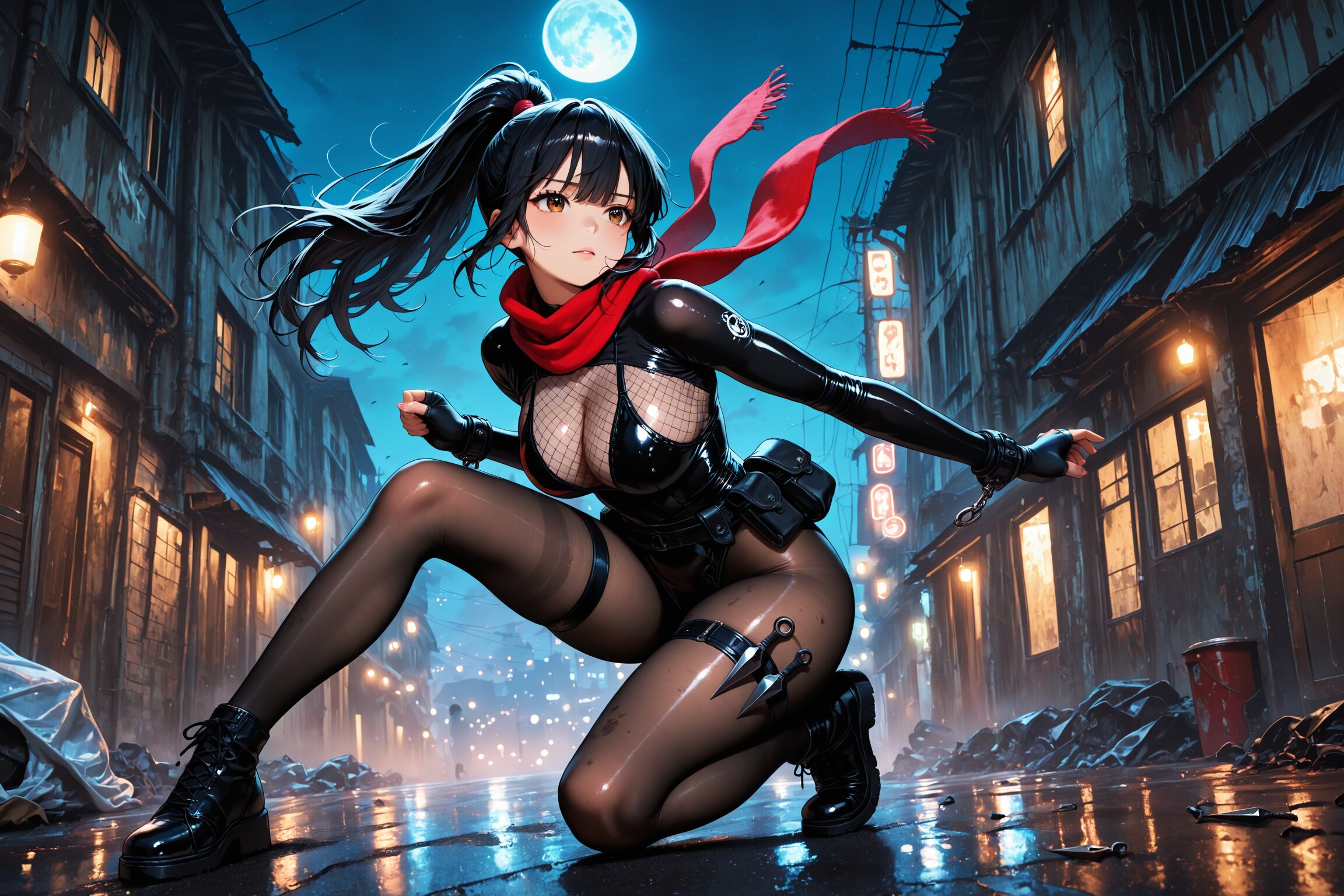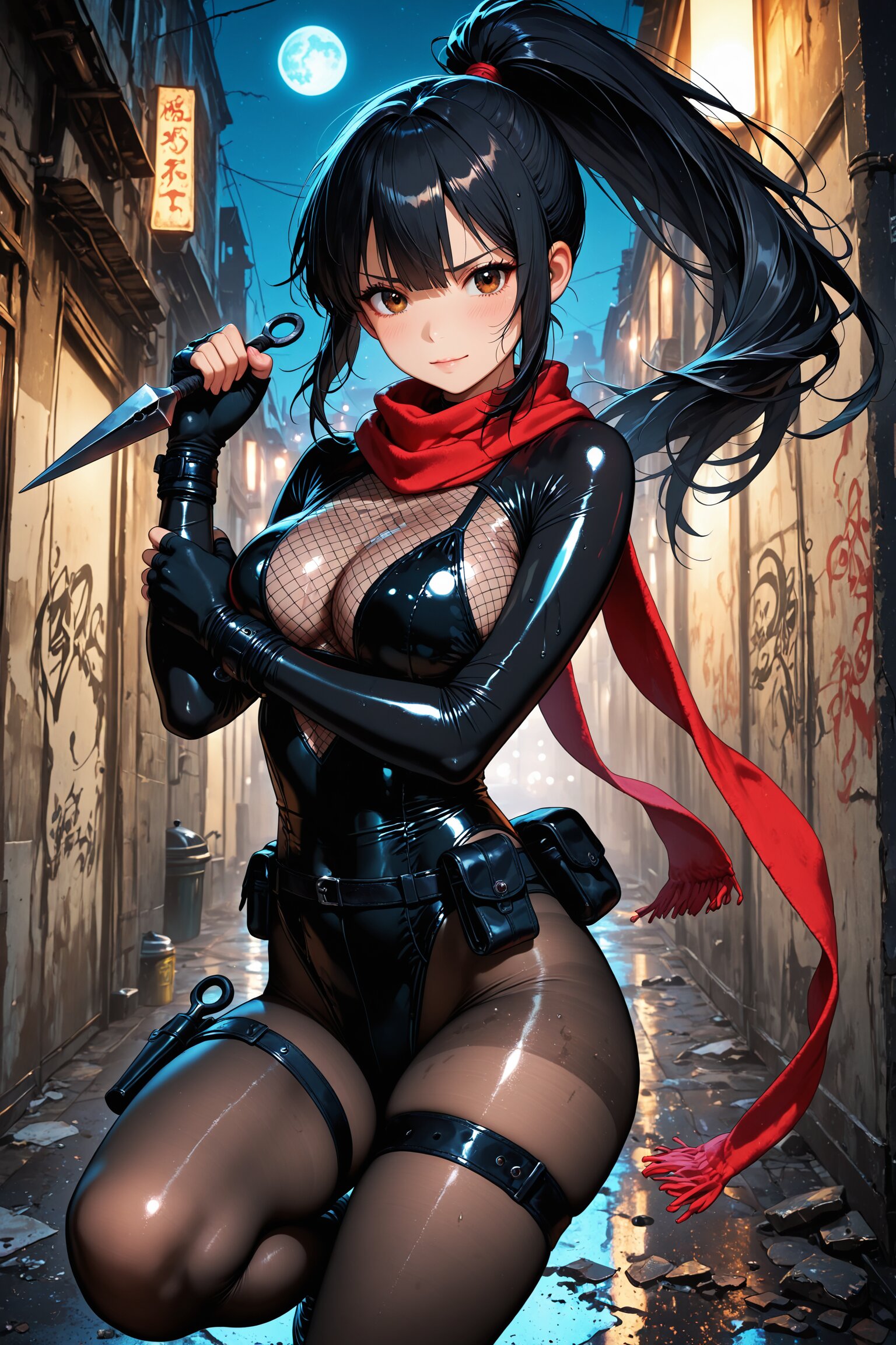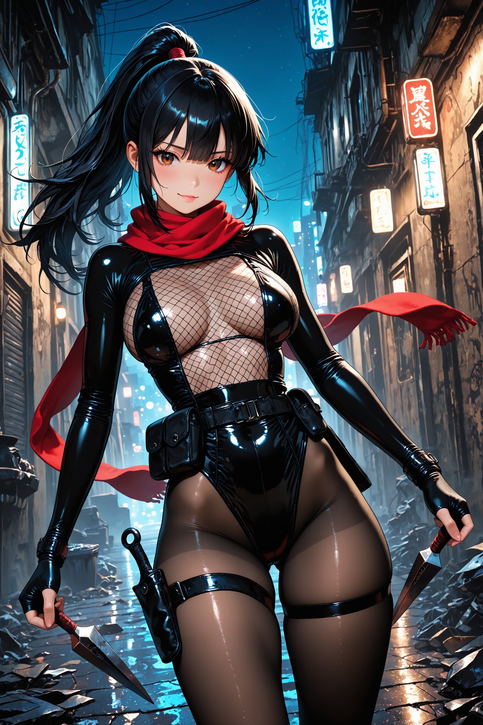 闇に現れたのは、黒のボディスーツに身を包んだ少女。肌を撫でるように艶めくその装束は、くノ一としての機能美と妖艶さを兼ね備えていた。太ももに装着された忍具入れから、静かにクナイを抜く所作さえも、舞のように美しい。