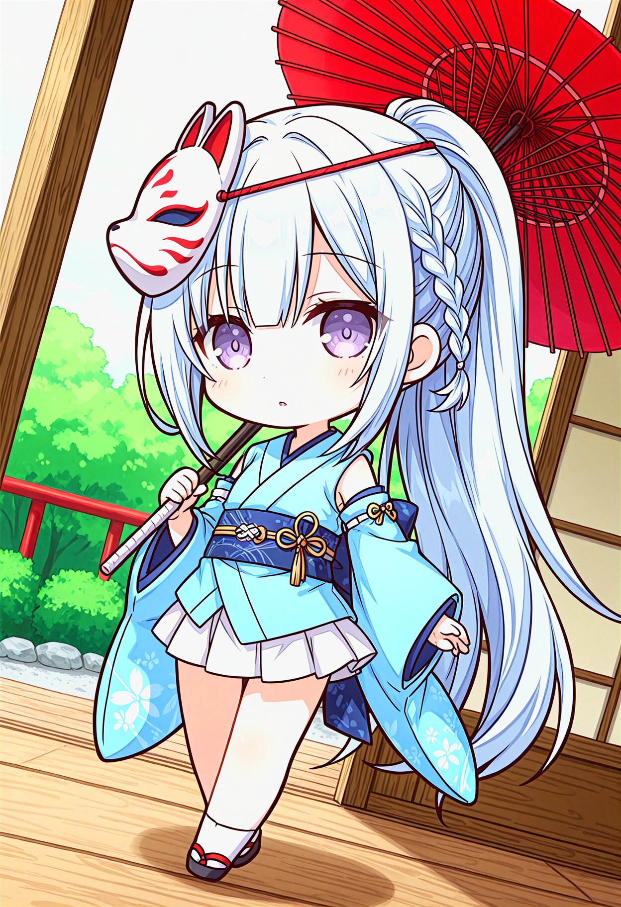 best quality, (pale color:0.7), full body, portrait, solo, (chibi), (chibi girl:1.2), oil-paper umbrella, parted lips,(Expressionless:0.8), (half-closed eyes:0.8), pale purple eyes, tareme, (silver hair:1.1), (dark blue hair colored inner hair:0.7), long hair,very long hair,ponytail, eyebrows visible through hair, detached sleeves, fox mask, mask on head, japanese clothes,blue kimono, obi, braid, umbrella, pleated skirt, white skirt, miniskirt, wide sleeves, sash, looking at viewer, holding, Japanese garden, dutch angle, <lora:noline-16oa:-1.1> <lora:chibi_paru:-1.3> <lora:sdxl2-flat2-512b:-1.1>